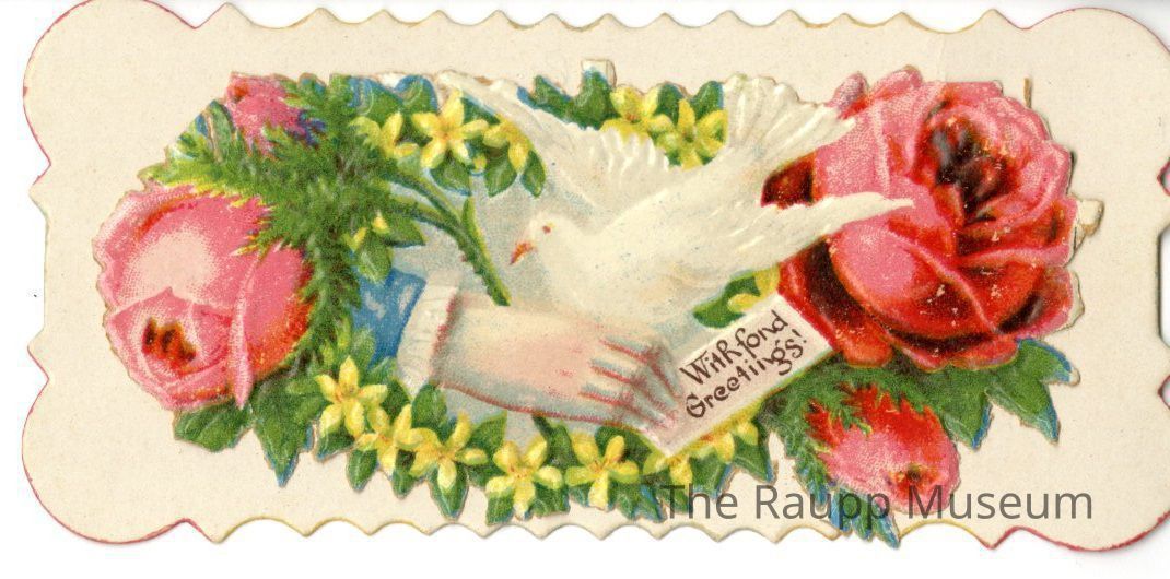 One (1) multicolored cardboard valentine card. Card has a white square background with decorative zig-zag edges and rounded corners. On the top is a smaller piece, featuring a hand holding a card with "With fond Greetings" on it, and a dove flying above the hand. There are yellow flowers around the dove and a large rose on the left and two roses on the right (one open and one closed). This flap is connect on the left and opens from the right to reveal: