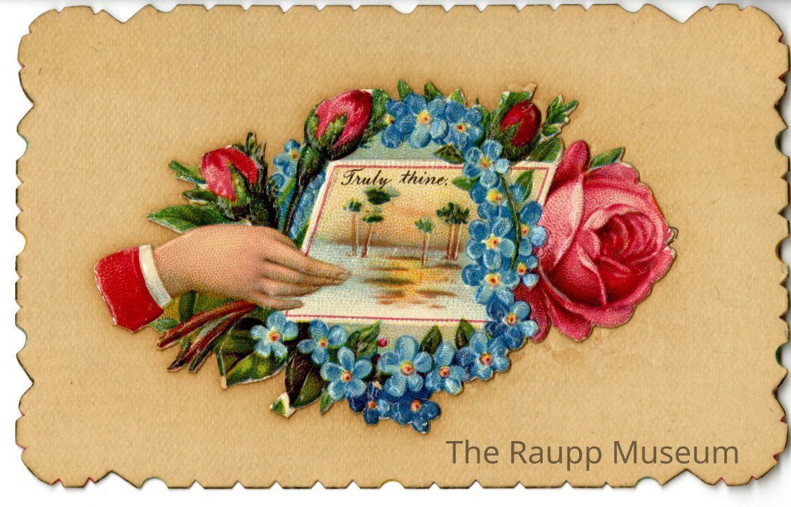 One (1) multicolored cardboard valentine card. Card has a brown cardboard background with zig-zag edges cut out circles along the border. On top is a smaller card that features a hand on the left reaching toward the center, with a wreath made of small blue flowers and larger red roses and leaves. Inside is a paper with a picture of trees and water and on the top left is written "Truly thine".