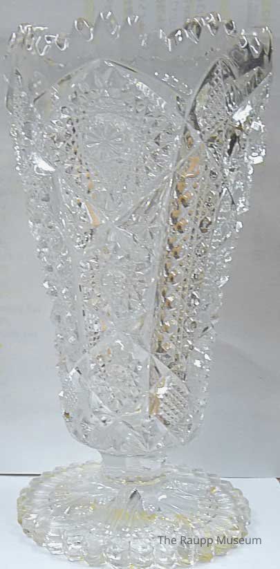 Clear crystal glass vase with round out turned base and carved diamond pattern with jagged rim.