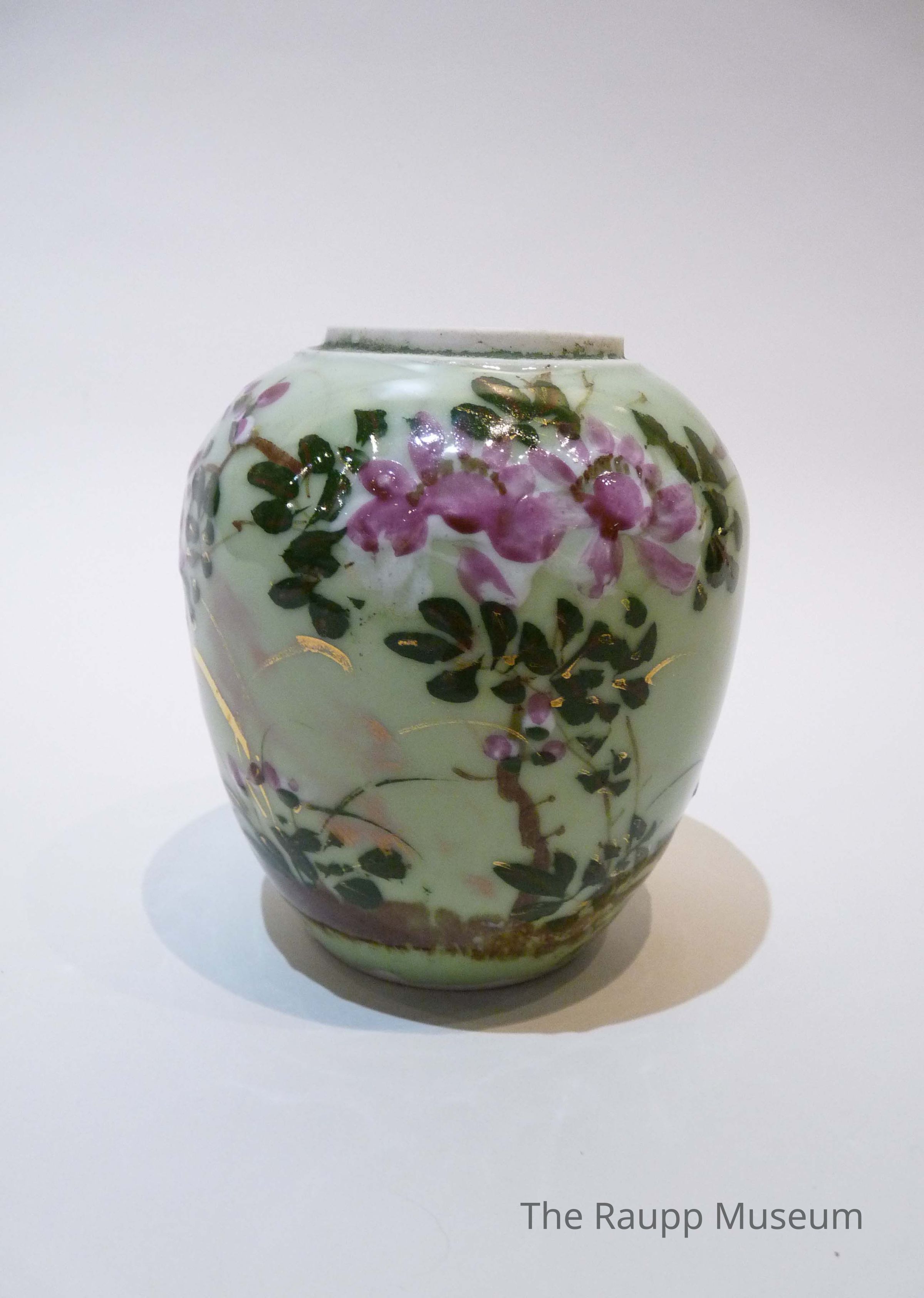 One (1) hand painted ceramic vase. Ceramic is white with green glaze over the body, purple and white flowers painted throughout with dark green leaves and gold accents. One side is blank, white flower extends almost around all other sides. Brown "dirt" painted on the bottom. Brown spot on inside base.Dimensions