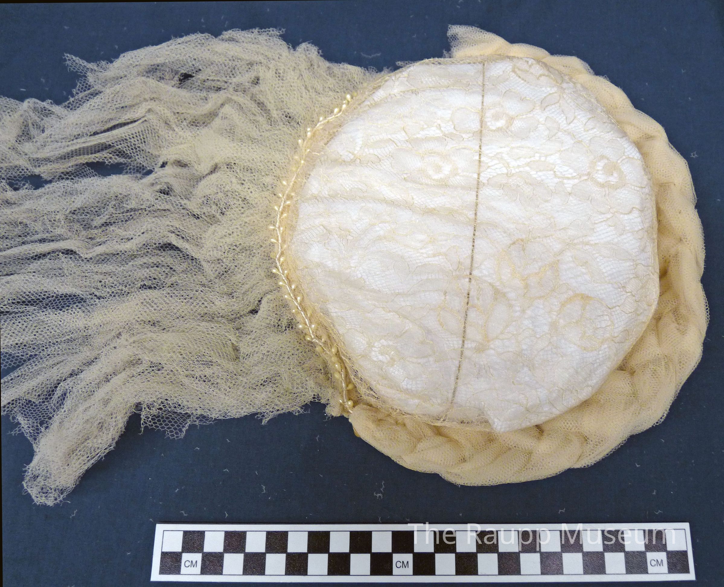 Long off-white tulle wedding veil and headpiece with pearls around the crown. Headpiece has lace cap and braided tulle around crown. Cloth wrapped metal wreath with pearls sewn around the base of the crown. String sewn into diameter of crown of headpiece interior.Relationships