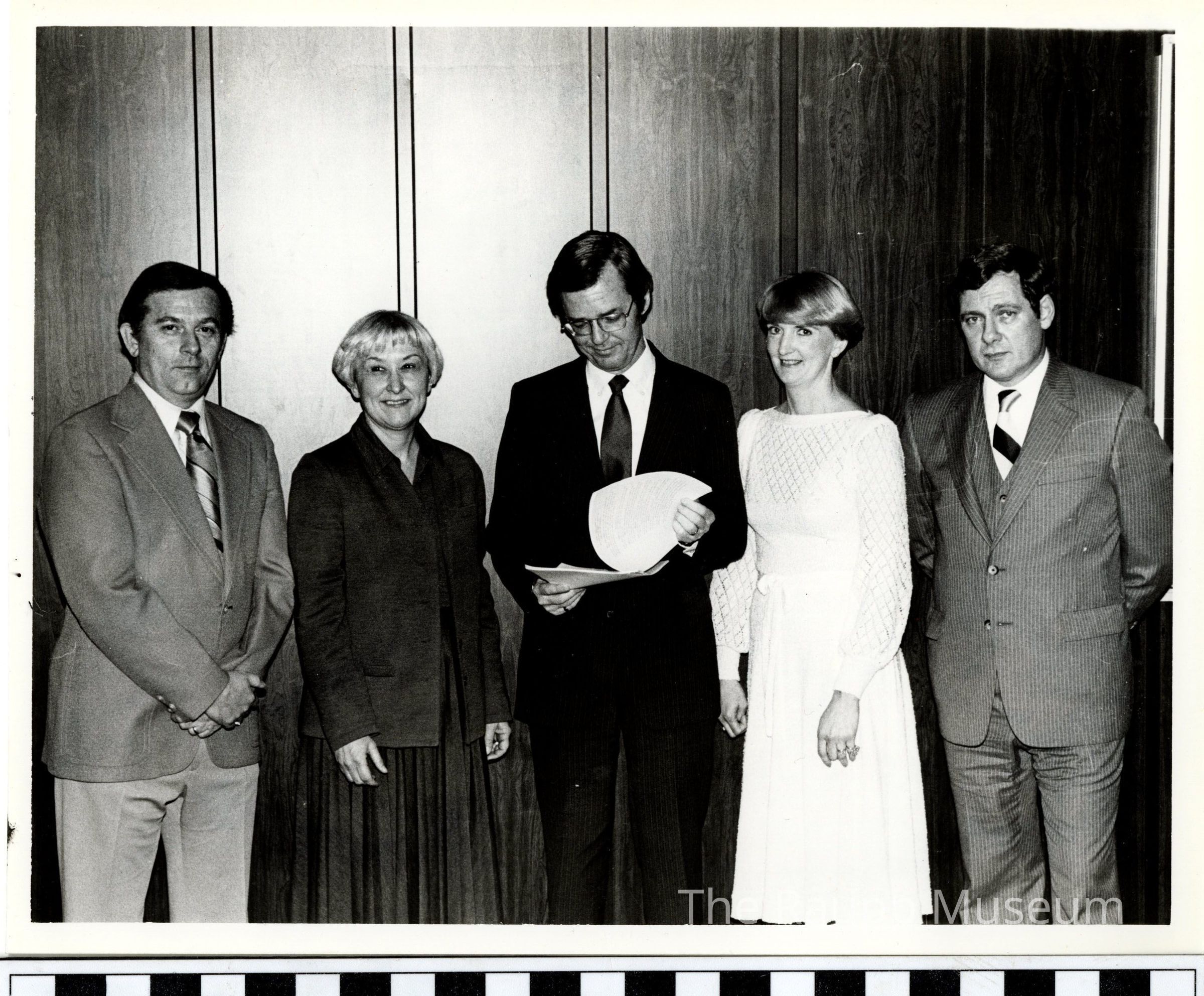 One (1) black and white photograph of 3 men, and 2 women (Verna Clayton is one on left) standing with a wooden wall behind. From left to right, man in light suit facing forward, women (Verna) smiling and facing forward in dark skirt and blazer, man looking down at papers in hand with black suit, women in white dress smiling looking forward, man in stripped light suit looking forward. On back is written "Buffalo Grove", and there is a paper note included "Verna Clayton Admin."Relationships