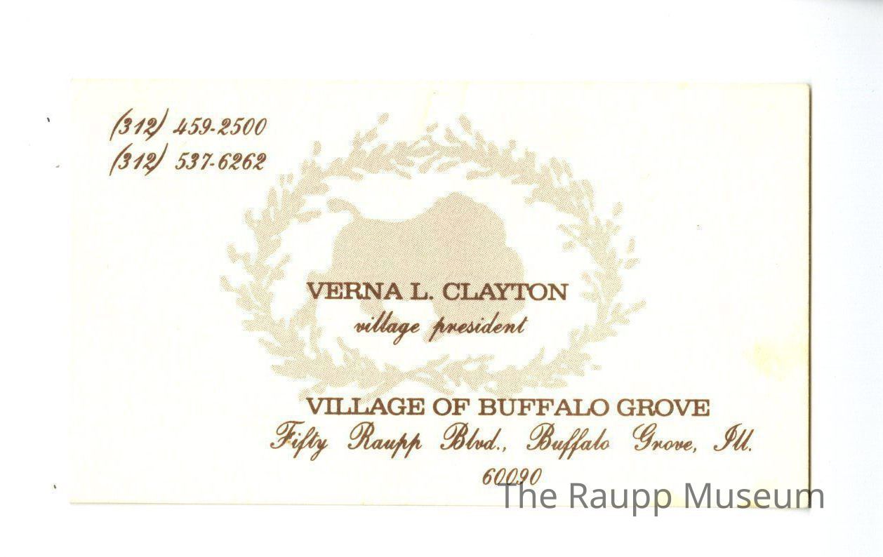 One (1) brown and white business card for Verna Clayton, Village President. Has village hall address, her phone number, fax #, and a buffalo stencil. It is in Korean on the other side.