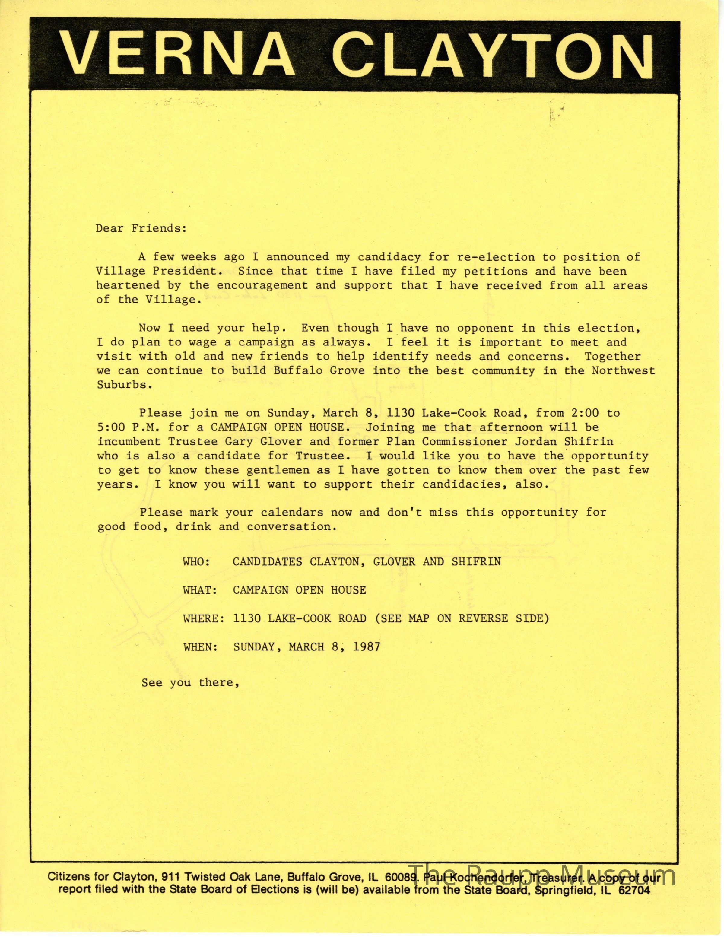 One (1) yellow paper letter from Verna Clayton to voters in Buffalo Grove to join her for a Campaign Open House on March 8, 1987. Has "VERNA CLAYTON" across the top.