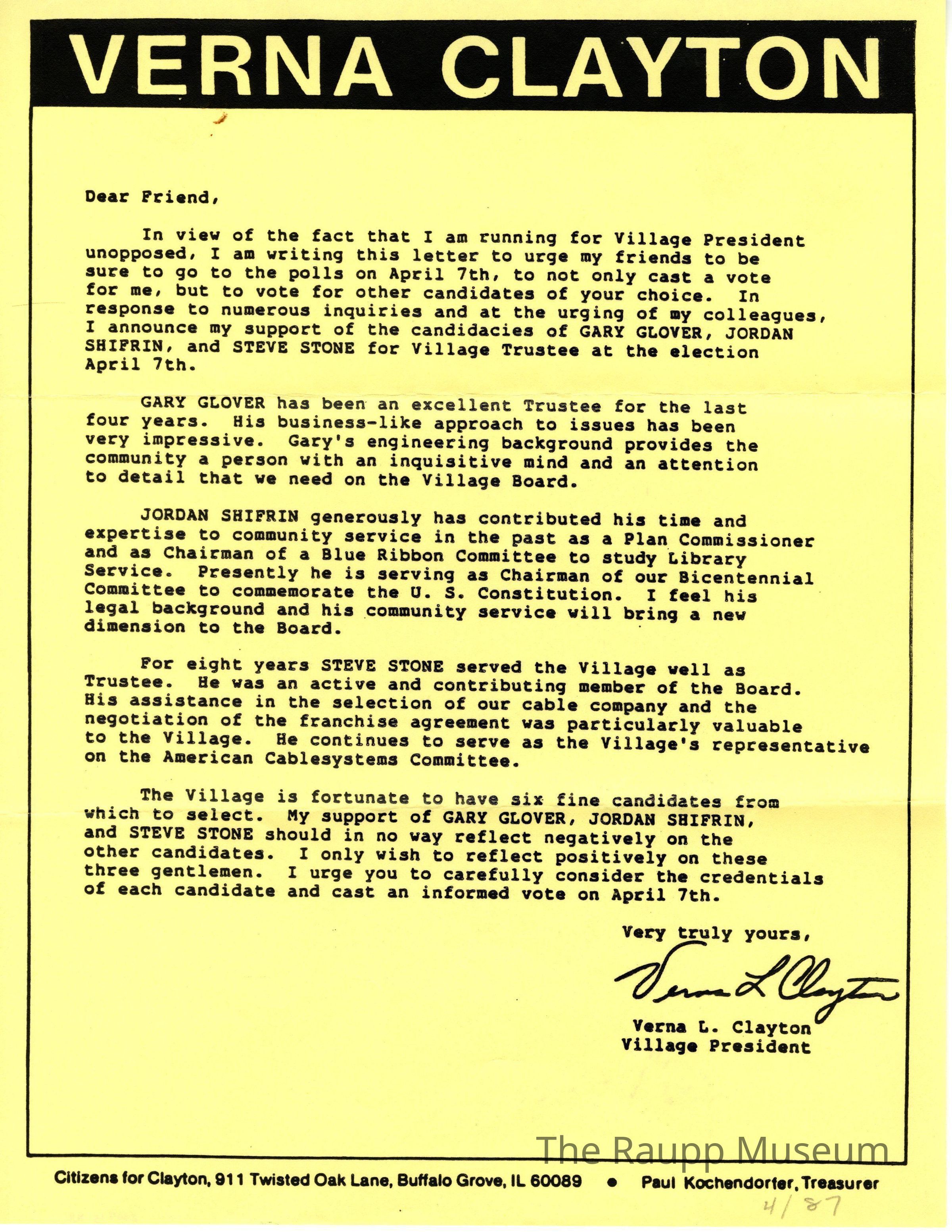 Two (2) yellow pamphlets for Verna Clayton for village president. One pamphlet is a third page with sample ballot and letter to residents from Verna Clayton, combined with another letter page.