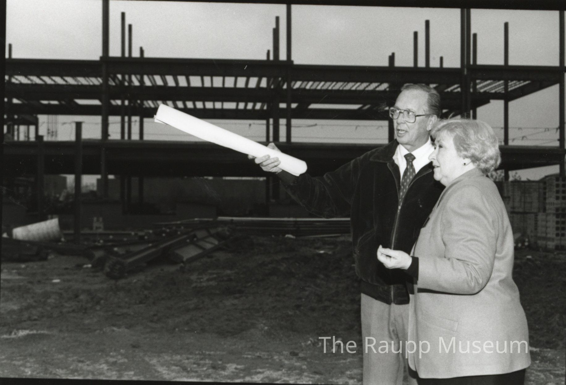 One (1) black and white photograph of Verna Clayton and a man looking in the distance with construction behind them. The man is pointing with rolled paper.Made/Created