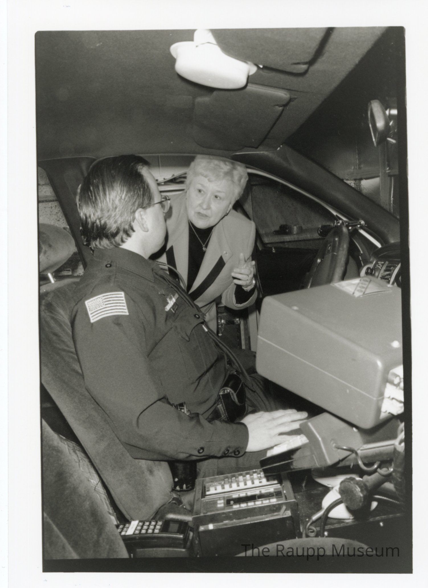 One (1) black and white photograph of Verna Clayton looking into a police car with a police officer in the drivers seat, speaking with him. There are large boxes around.Made/Created