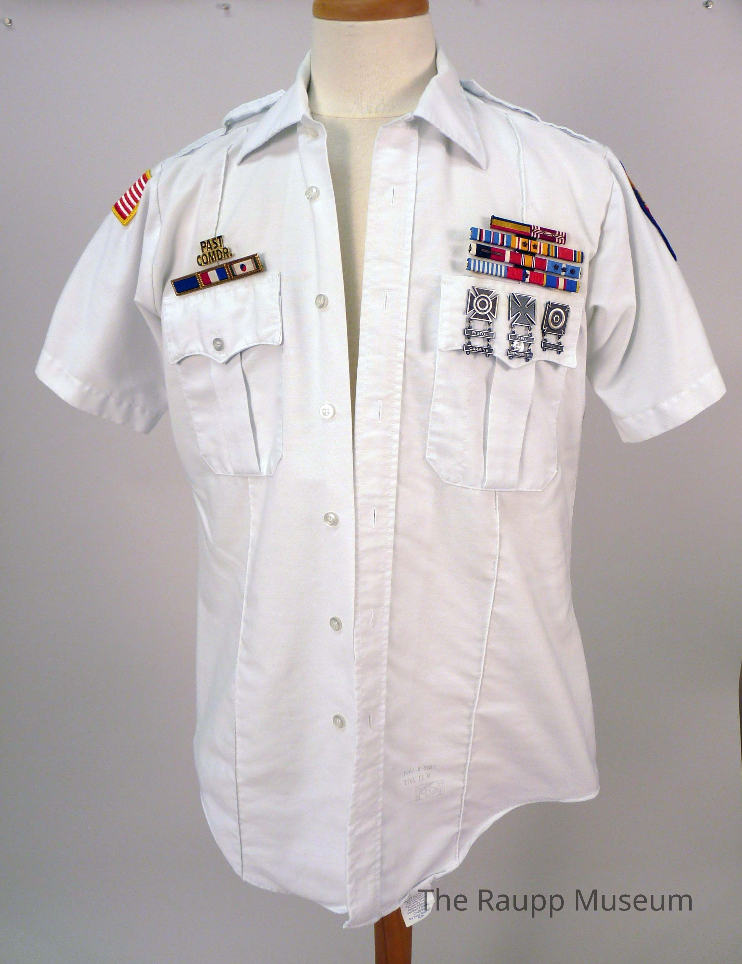 One (1) white cotton collared short sleeve shirt with military patches and badges affixed. There are two pockets on the breast area with white plastic buttons. There is a button on both shoulders holding a flap of fabric over. On the left arm is a VFW blue red and orange rectangular patch. On the right arm is an American Flag patch. On the left breast is 4 lines of rectangular colored military markers. Underneath are three metal medals, with a clover like design (each a little different) and names underneath (left to right: Pistol Carbine, Rifle Submachine Gun, Driver-W). On the right breast is a gold clip "Past Comor." and three flag like rectangular patches with gold outlines.