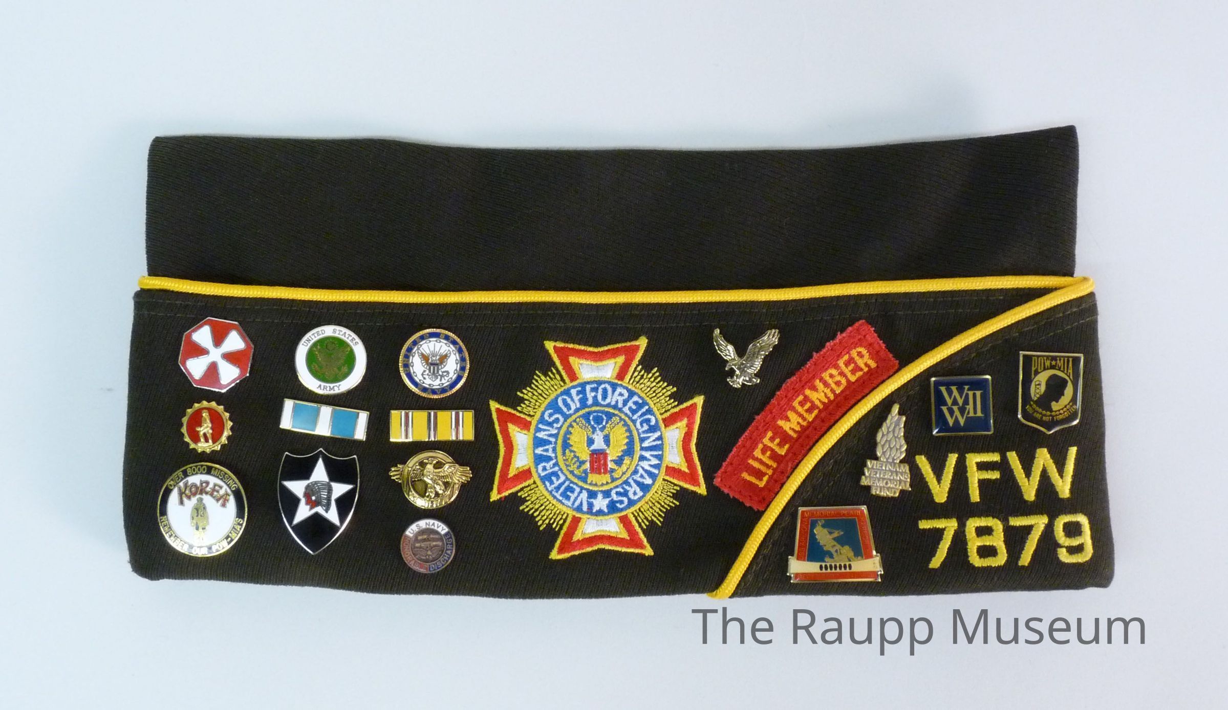 One (1) Dacron/polyester/wool VFW cap. The cap is dark green with yellow lettering on the center of one side: "Past Post Commander Buffalo Grove Illinois", and "VFW 7879" on the bottom right of the other side. The first side has 16 military related pins, including 9 from different years of Veterans Helping Veterans, an American Flag, 3 related to VFW, a flower, and a memorial pin.