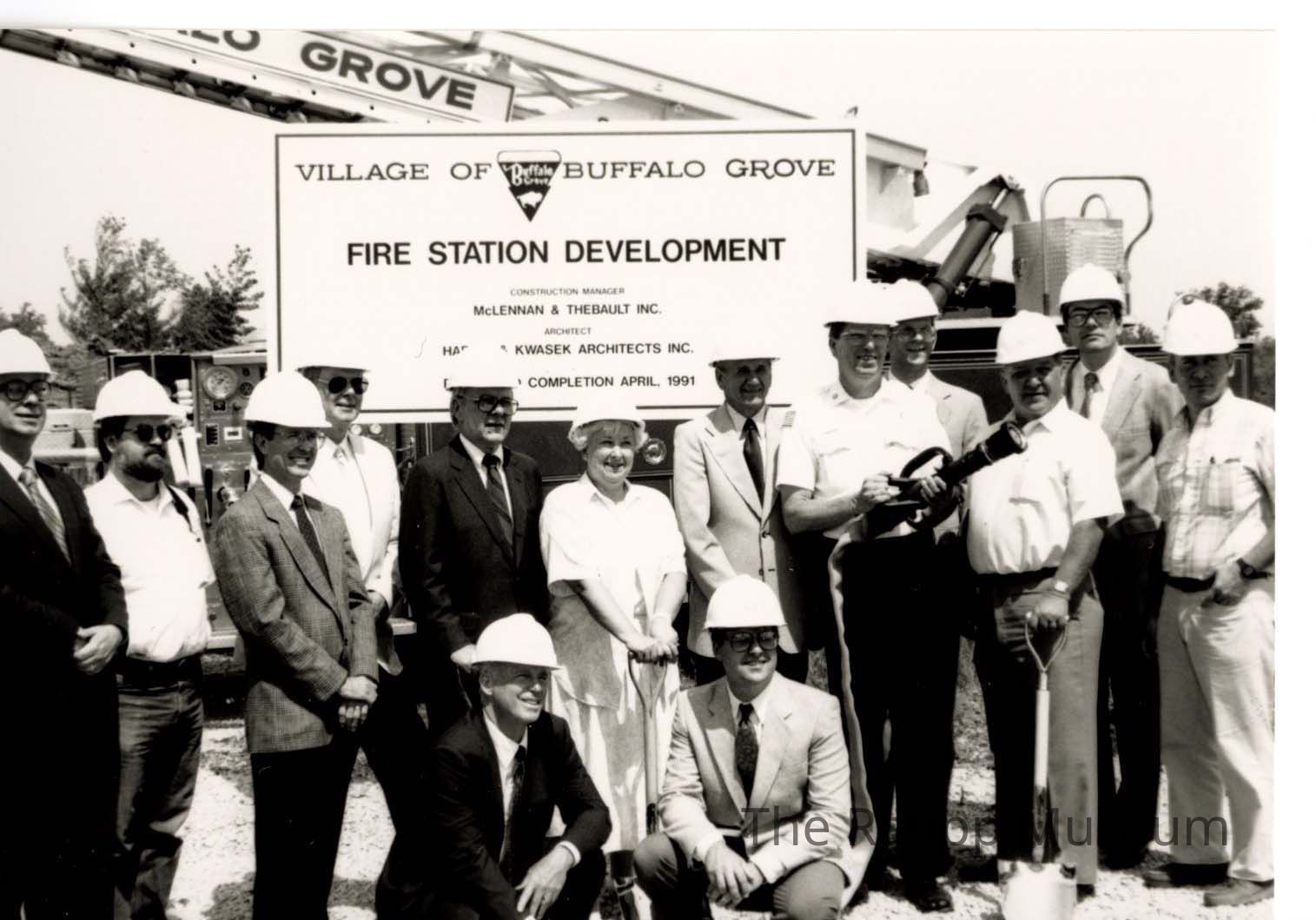 One (1) black and white photo of Village and Fire Station staff standing for a photo in front of the Fire Station Development sign (completion 1991). Verna Clayton is in the center holding a shovel. Everyone has white hard hats on. Fire Truck in the bacMade/Created