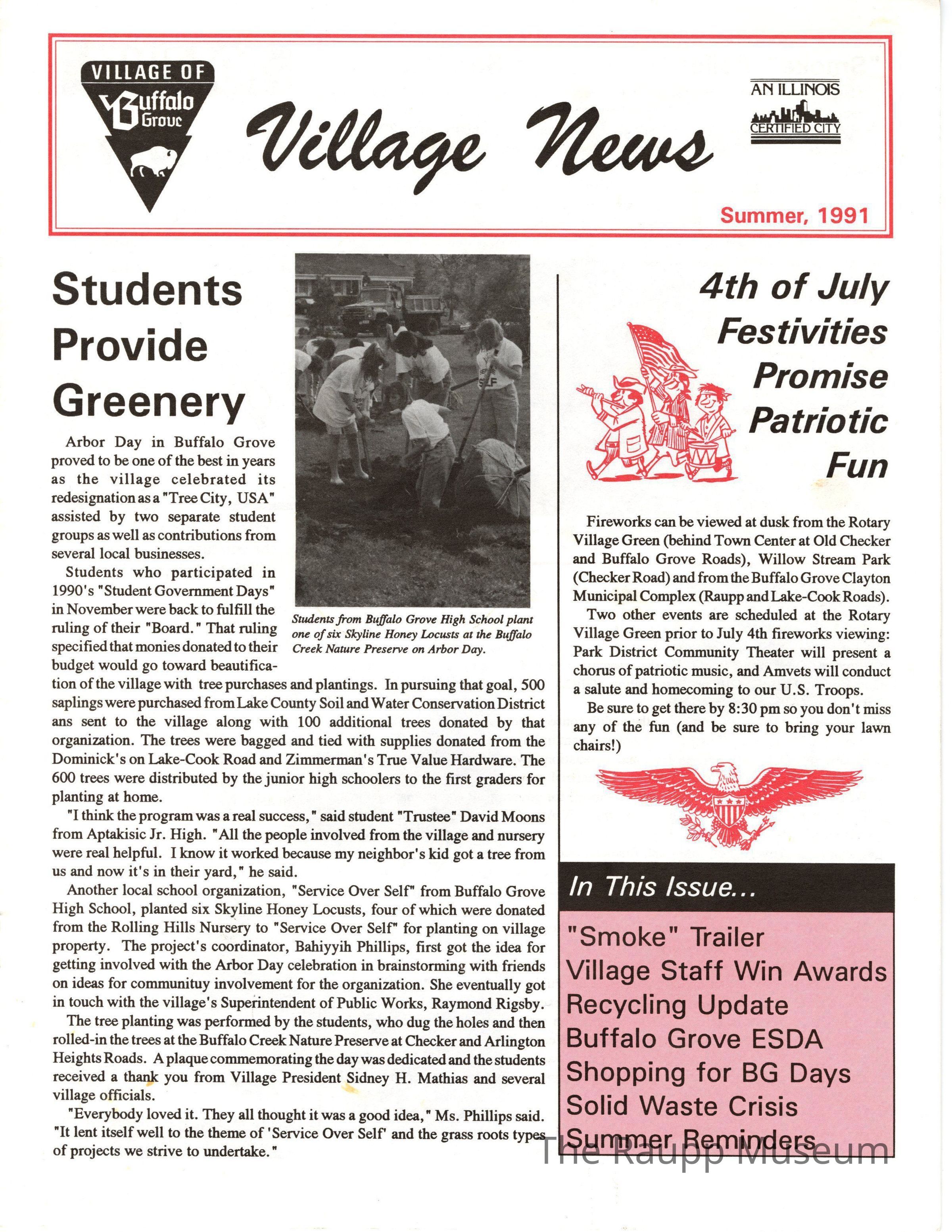 One (1) Village News newspaper for the Village of Buffalo Grove. This issue is a Summer 1991 and contains information and schedule for 4th of July events, in addition to some other general village news. News opens long edge, right to left like a pamphlet. It is red, white, and black. There are staples on the left side binding the paper.