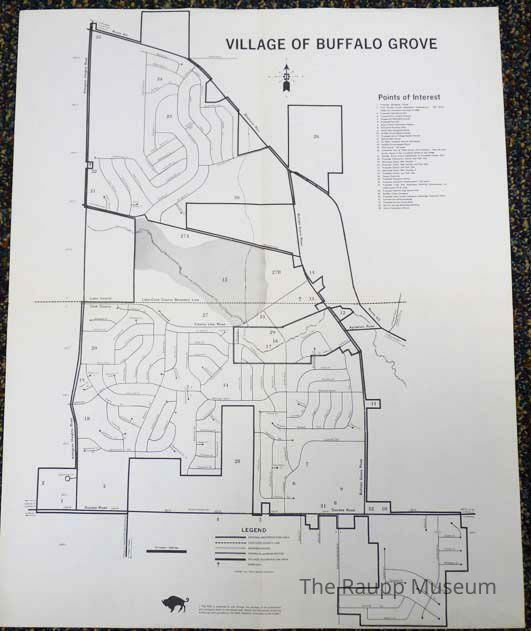 Black and white single-sided map of Buffalo Grove. Map of Buffalo Grove roads with 34 various "points of interests" including schools, parks and other public buildings listed in the upper right area of the front. The map also shows the original boundaries of the village. The reverse side with cover contains a list of local businesses who helped fund the map. Identical map to 2004.10.001Map Details