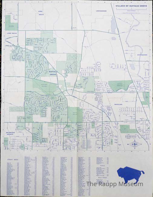 Double-sided, color street map of Buffalo Grove. Front of the map is green and blue with "Village of Buffalo Grove" title in the upper right corner, street index across the bottom and a silhouette of a buffalo in the lower right corner. reverse side has cover with outline with Village of Buffalo Grove logo in a triangular arrow shape and village services, ordinances, and general information. reverse has an ad for the Bank of Buffalo Grove.Map Details