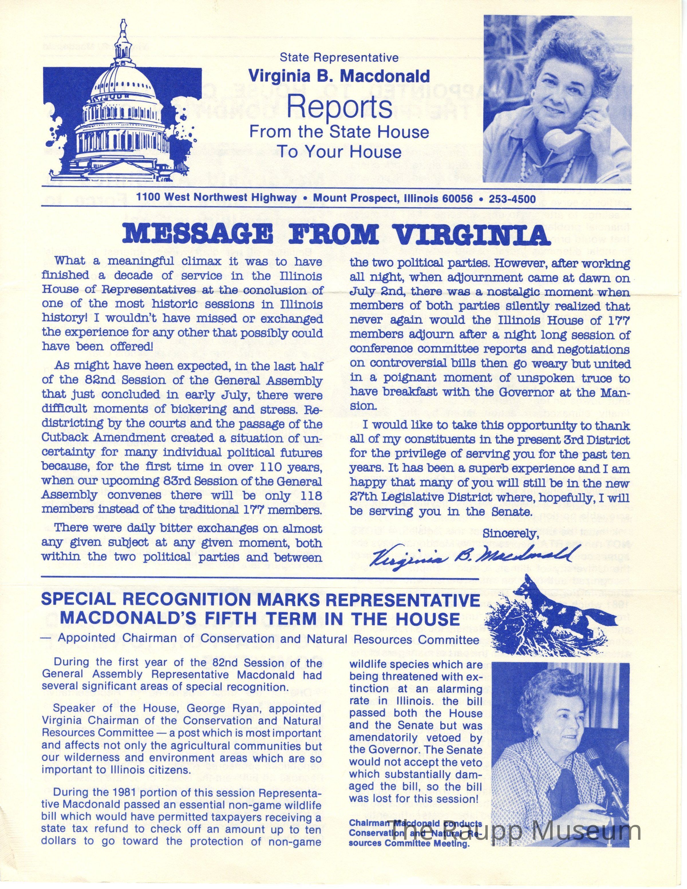 One (1) 4 page blue and white report from Virginia C. Macdonald, the Illinois House of Representative.