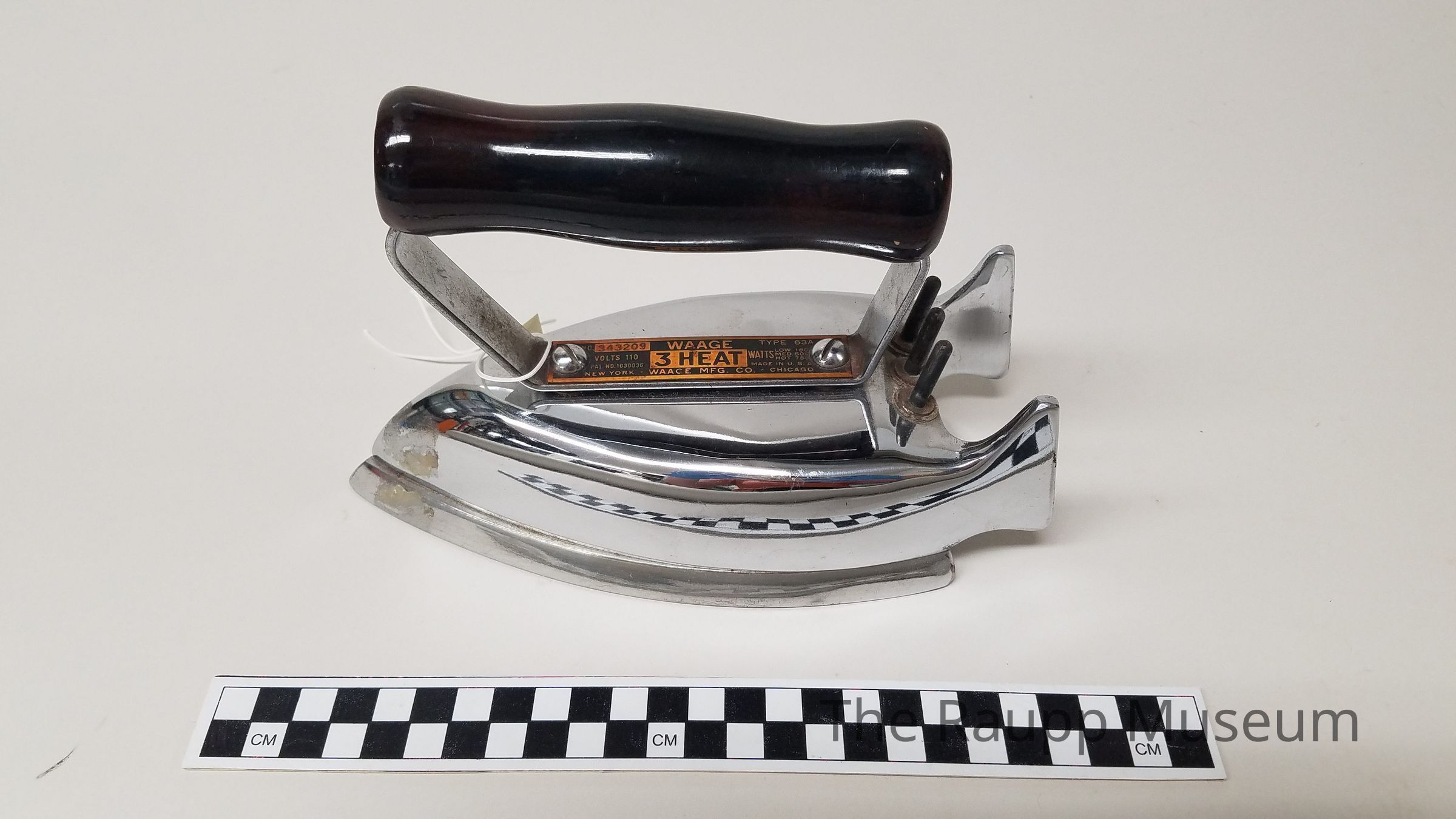 One (1) Waage Mfg. Co. metal flat iron. Chrome iron with a red and black wood handle. Iron has two metal fins at the back to allow it to stand upright without tipping. Black and brown plastic plug with a brown and yellow stripped cord. Cord has a square end with three holes to plug into the back of the iron, where three metal rods stick out. The center of handle on iron has label information "Waage Mfg. Co. 3 Heat, New York, Chicago, Made in USA., No. 343209, Volts 110, Pat. No. 1030036, Type 63A, WATTS Low 180 Med 500 Hot 750."Dimensions