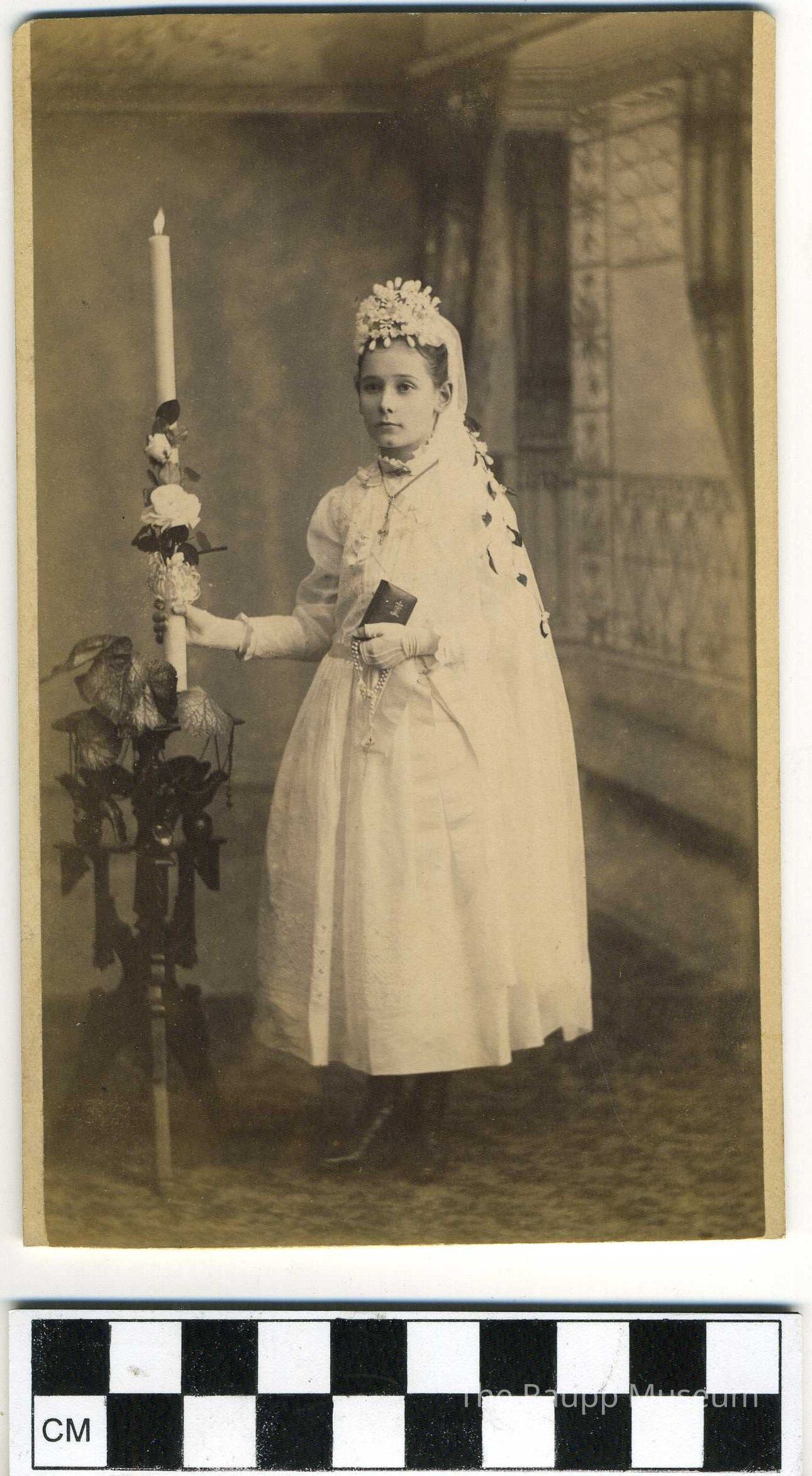 Black and white portrait mounted to a heavy card. Image of a Walburga Kreutzer's confirmation. She is holding a prayer book, and a rosary with one hand on a long taper candle stand. She is wearing a white ankle dress and slightly puffy sleeves at the elbow, black boots and long veil with headpiece. Photography studio backdrop. There is a balcony or window in the background with decorative steel grid.