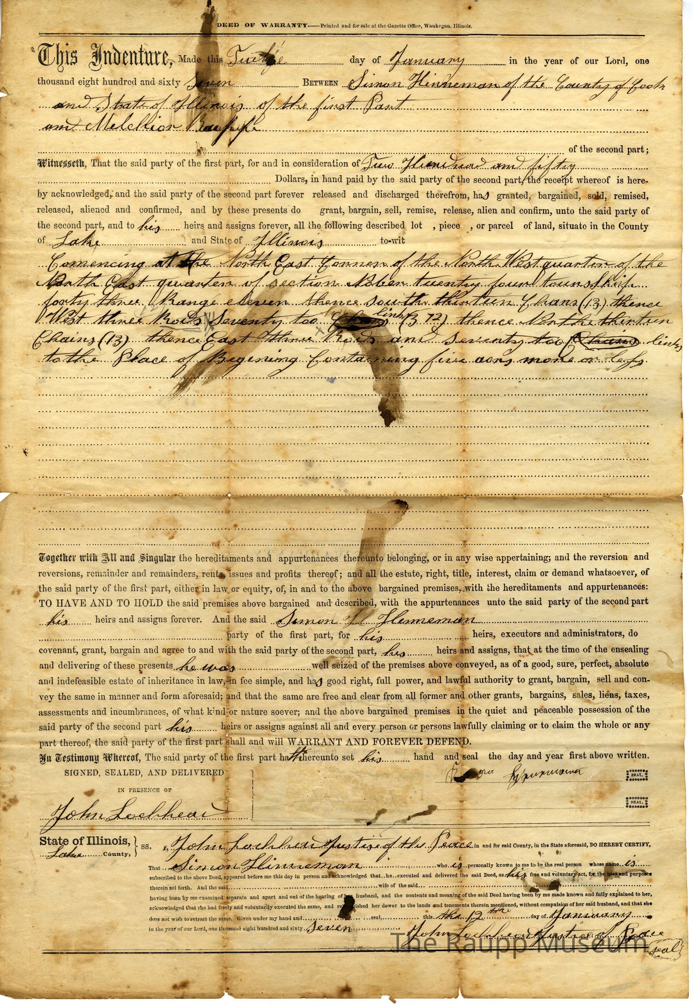 One (1) warranty deed between Simon Henneman and Melchior Raupp for land for a total of $250, dated 01/12/1867. Paper ha preprinted parts with handwritten information filled into blank spaces on the deed. On half of the back in the middle is a summary of the deed as well as court filling information and date.Archive Details