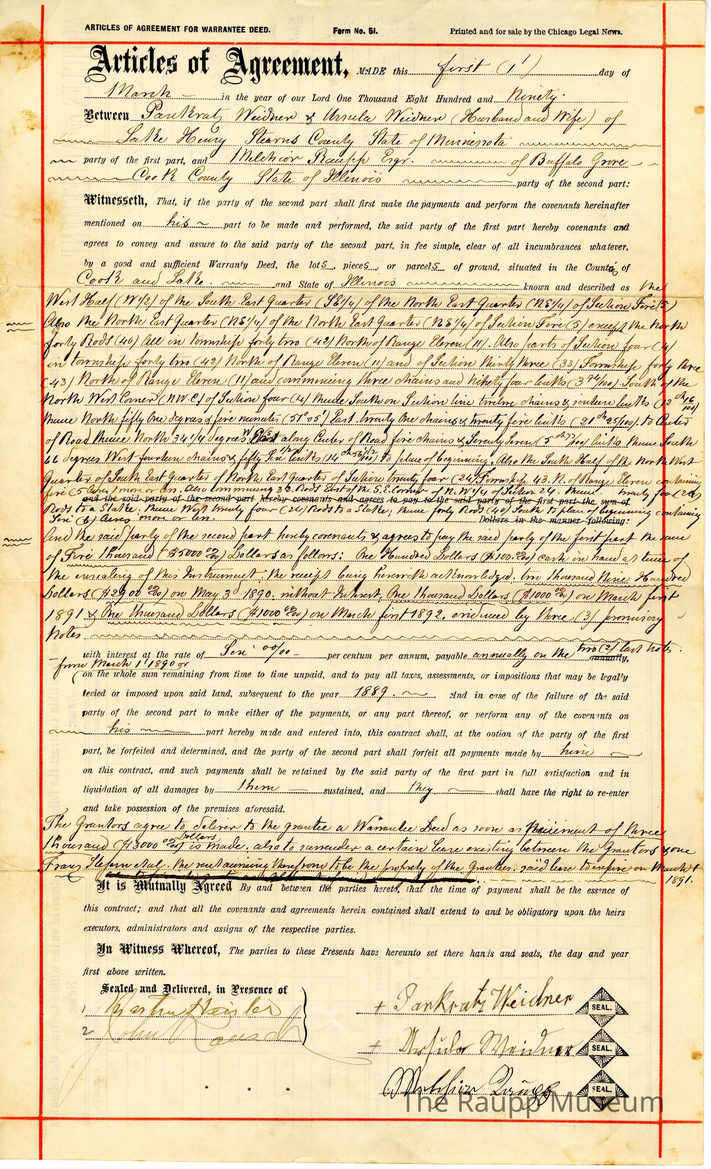 One (1) warranty deed between Pancratz and Ursula Weidner and Melchior Raupp. The land was situated in Cook and Lake County. There are pre-printed sections filled in with brown/black ink handwriting, including a description of the land, names, and signatures. On the back There are four pre-printed sections, from left to right: A "Articles of Agreement" cover page, followed by three tables sections with "Received on the within Contract the following sums".Archive Details