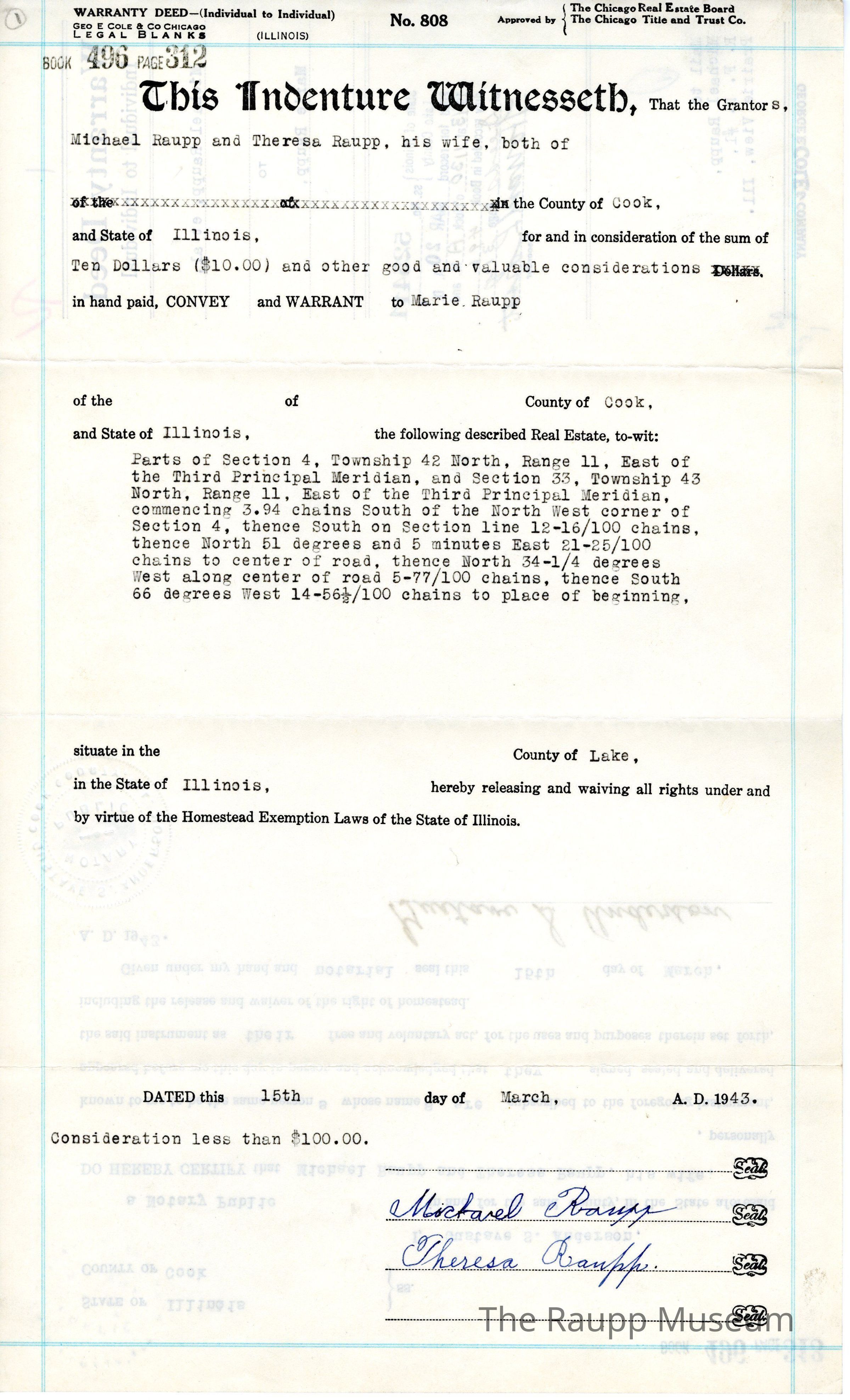 One (1) warranty deed between Michael and Theresa Raupp and Marie Raupp for the sale of land in Lake County for $10.00 on March 15, 1943. The page contains pre-printed and typed text in empty spaces. It is signed at the bottom. There is a double blue-line border around document. The back has the notary statement and signature on one side, and a cover page on the corner of the other side with "Warranty Deed; Individual to Individual".Archive Details