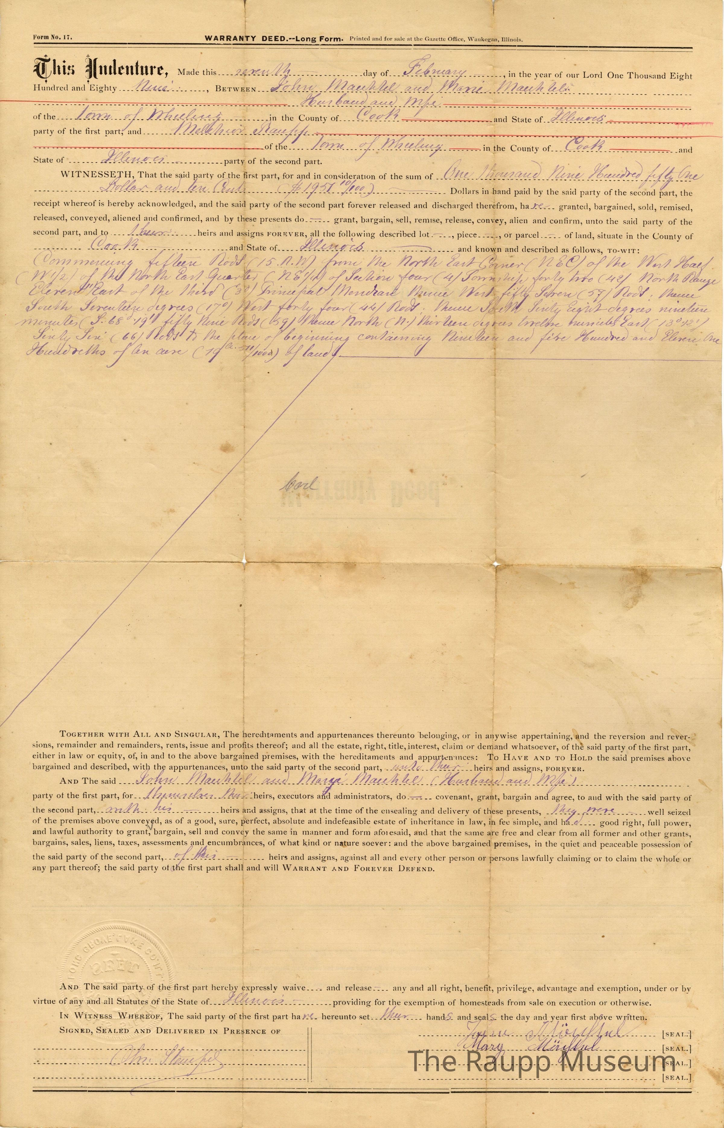 Warranty Deed John and Marie Mauklel to Melchior Raupp 1889Entry/Object ID