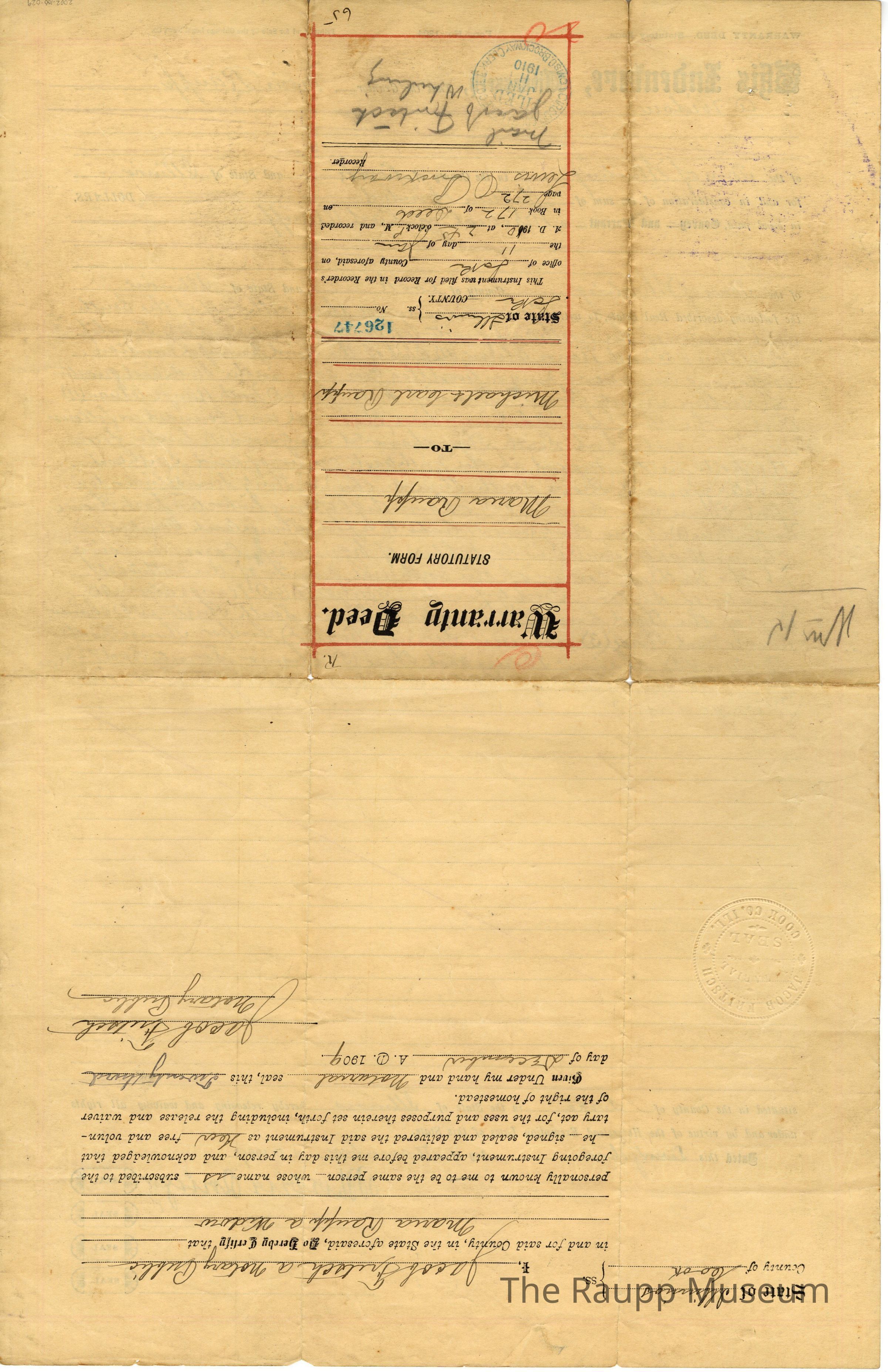 One (1) page, double sided, Warranty Deed of Maria Raupp selling land to Michael Raupp and Carl Raupp for $1500, dated 12/23/1909. Document is brown paper with two pink lined border around the edges. The document has a mixture of decorative pre-printed text with handwritten text in black ink (on majority of document). There is a stamp on bottom left.