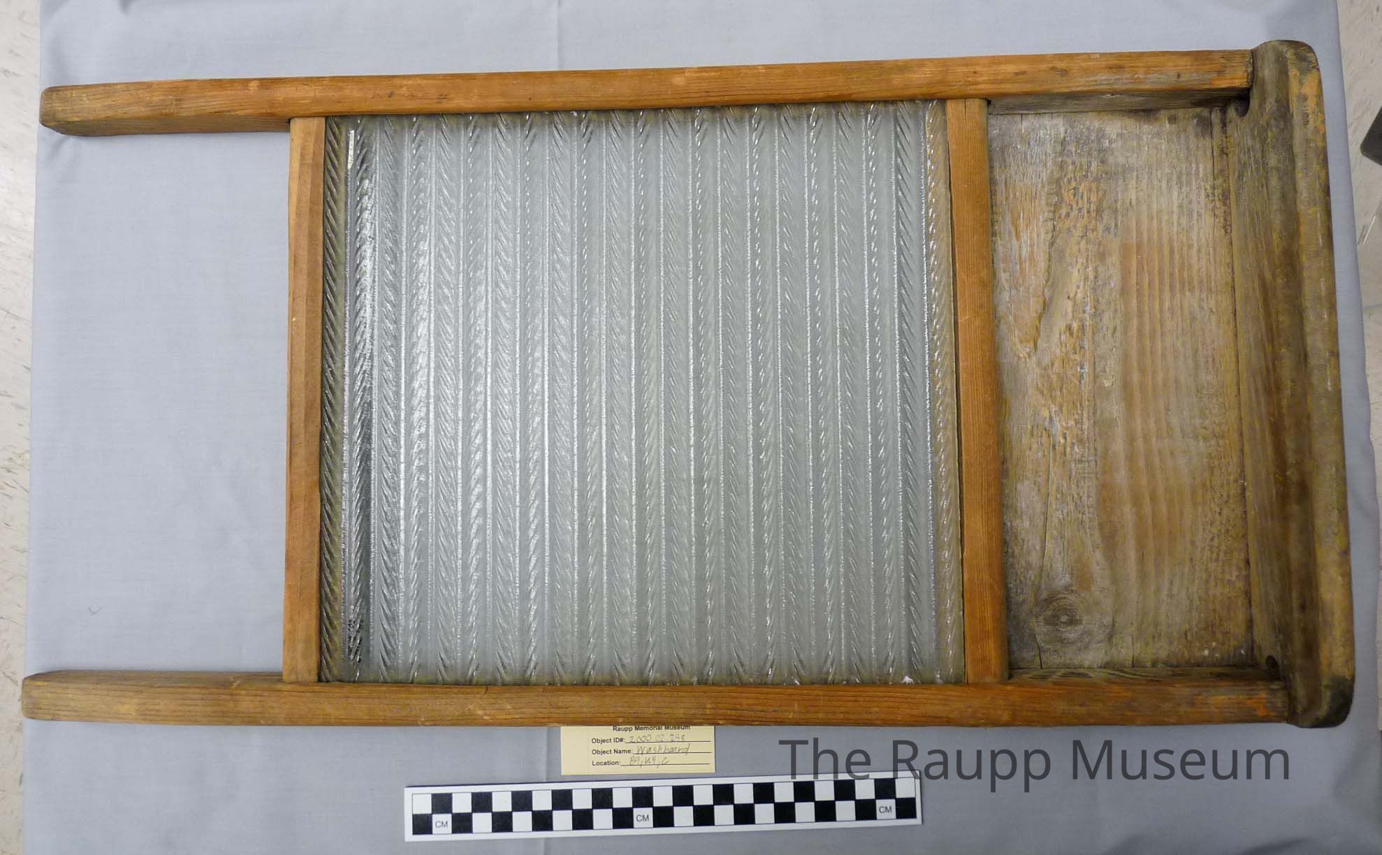 One (1) rectangular wood and glass washboard. The glass washboard has hatches running opposite each other on each horizontal glass notch. Nails hold the wood together. One side on top of the wood has a flat board, whereas the other side is open. The object is directly labeled with black ink on a white background.Dimensions