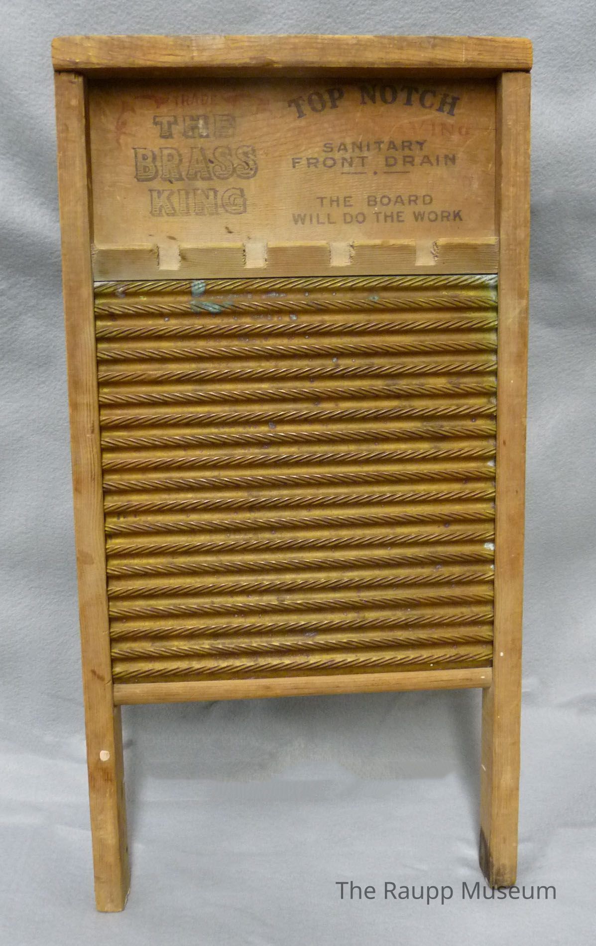 One (1) wooden and metal washboard. One side has the bronze metal washboard in the center with ribbed edges, and a wooden frame and top. On top is printed: "Trade The Brass King; Top Notch; Soap Saving; Sanitary Front Drain; The Board Will Do The Work". There are four cut edges under the text.