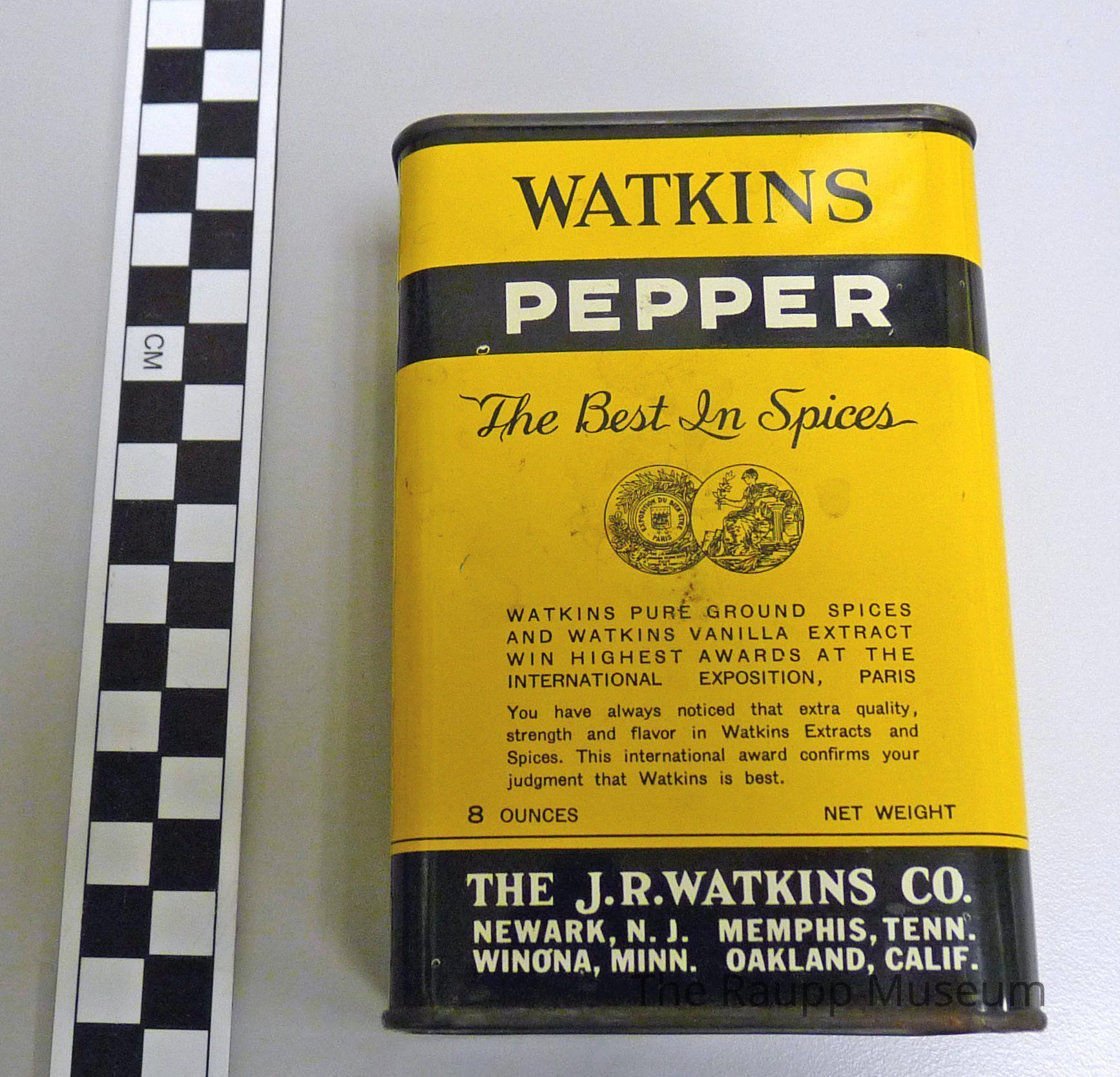 Rectangular Watkins spice tin. Yellow and black color block exterior. Oval lid with shaker perforations. Container holds eight ounces; empty of contents.Dimensions