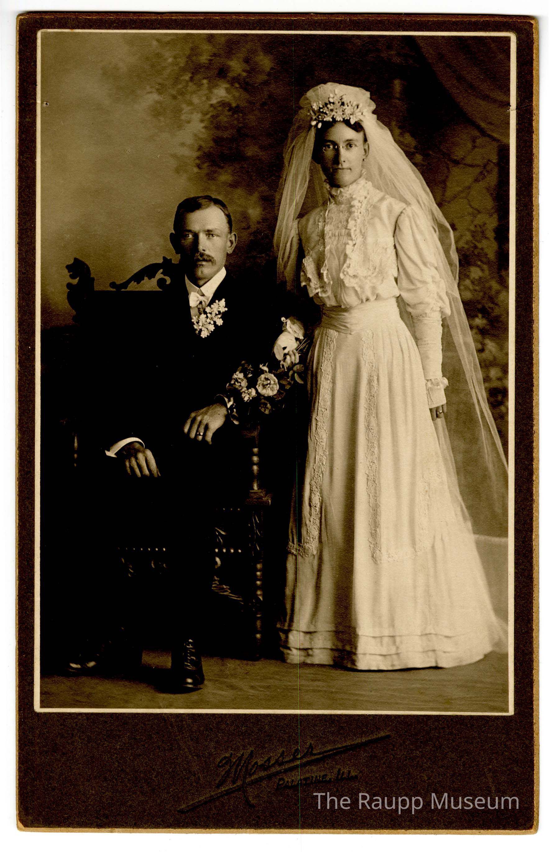 One (1) black and white wedding portrait of unknown couple. The groom is seated on the left, wearing a dark suit adorned with a boutonnière. The bride stands beside him on the right, dressed in an elaborately detailed long white gown featuring lace embellishments and a high neck, with a long sheer veil that reaches to the floor with an intricately floral headdress resting on her head. She holds a bouquet in her right hand, resting on the chair arm. The background is a studio painted background with trees and a curtain on the right corner.