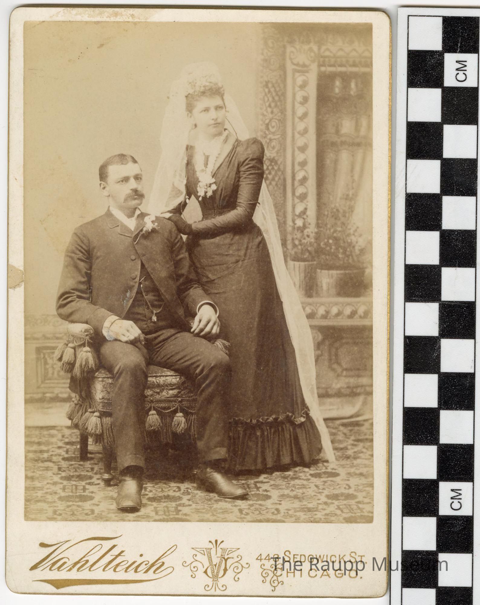 The frame has "Vahlteich, 443 Sedgwick St. Chicago" imprinted in gold print on the bottom. The back has a decorative brown frame and "Vahlteich" in a circular decorated logo. Also printed on the back is "443 Sedgwick Street, Chicago, Duplicates furnished at any time." "Mr & Mrs Christof Dittrich" written in pencil on bottom.Dimensions
