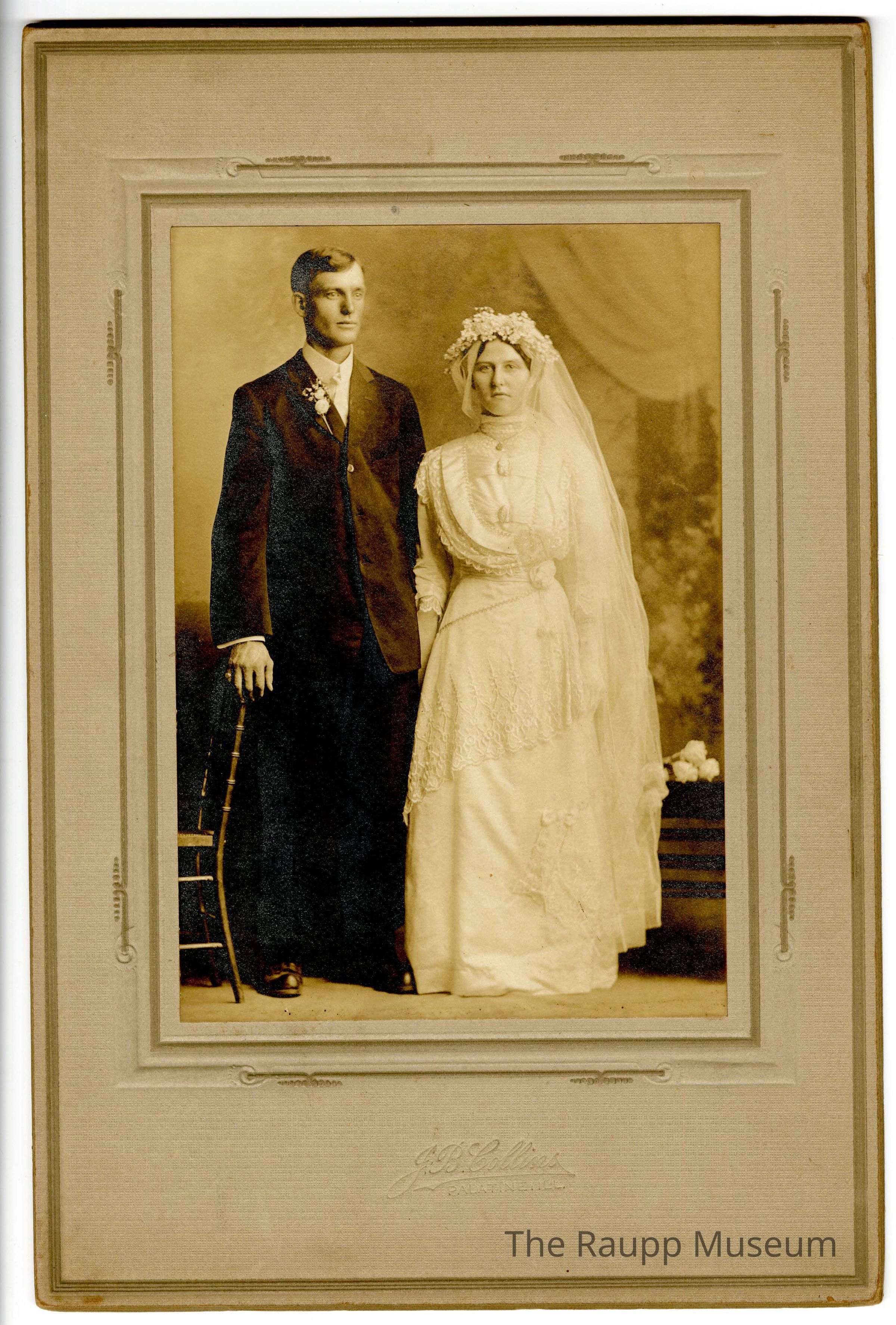 One (1) sepia-toned cabinet photograph of a professional wedding portrait featuring a couple standing side by side; the groom is on the left, dressed in a formal dark suit with a boutonniere pinned to his jacket, while the bride, on the right, is wearing a long white wedding gown with intricate lace details, a high collar, and a flowing veil with floral accents on her head. The man is resting his right hand on a wooden chair. The background is painted with floral and drapes. The photograph is encased within a cardboard frame with embossed decorations and text at the bottom: "J.B. Collins, Palatine, ILL".Dimensions