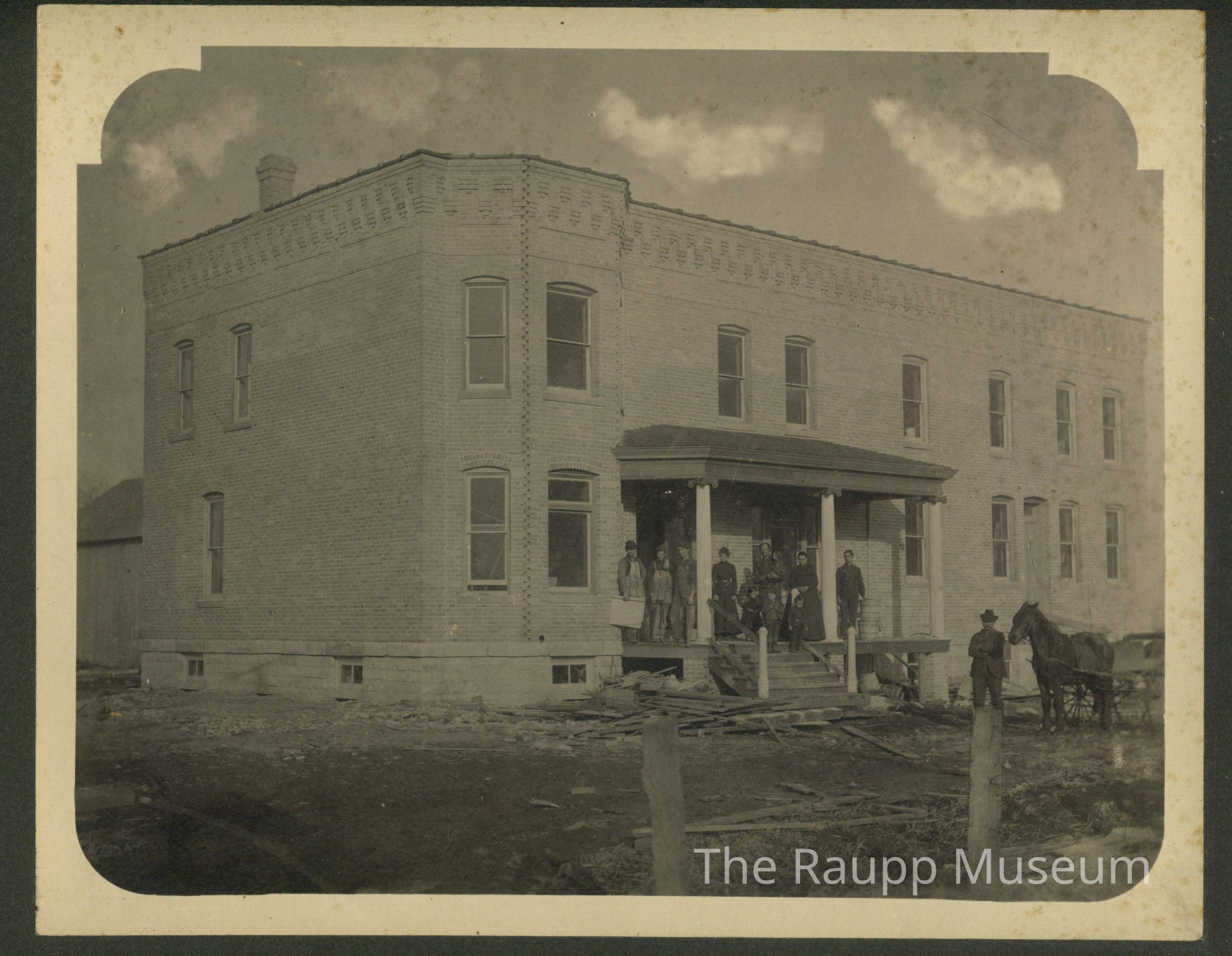 Black and white print with rounded, scalloped edges, white border and mounted to heavy gray card. Image of brick building exterior and people standing on the front steps. Building is rectangular with two stories and small porch overhang with two columns. Man with a horse standing in the far right area of the image.Dimensions