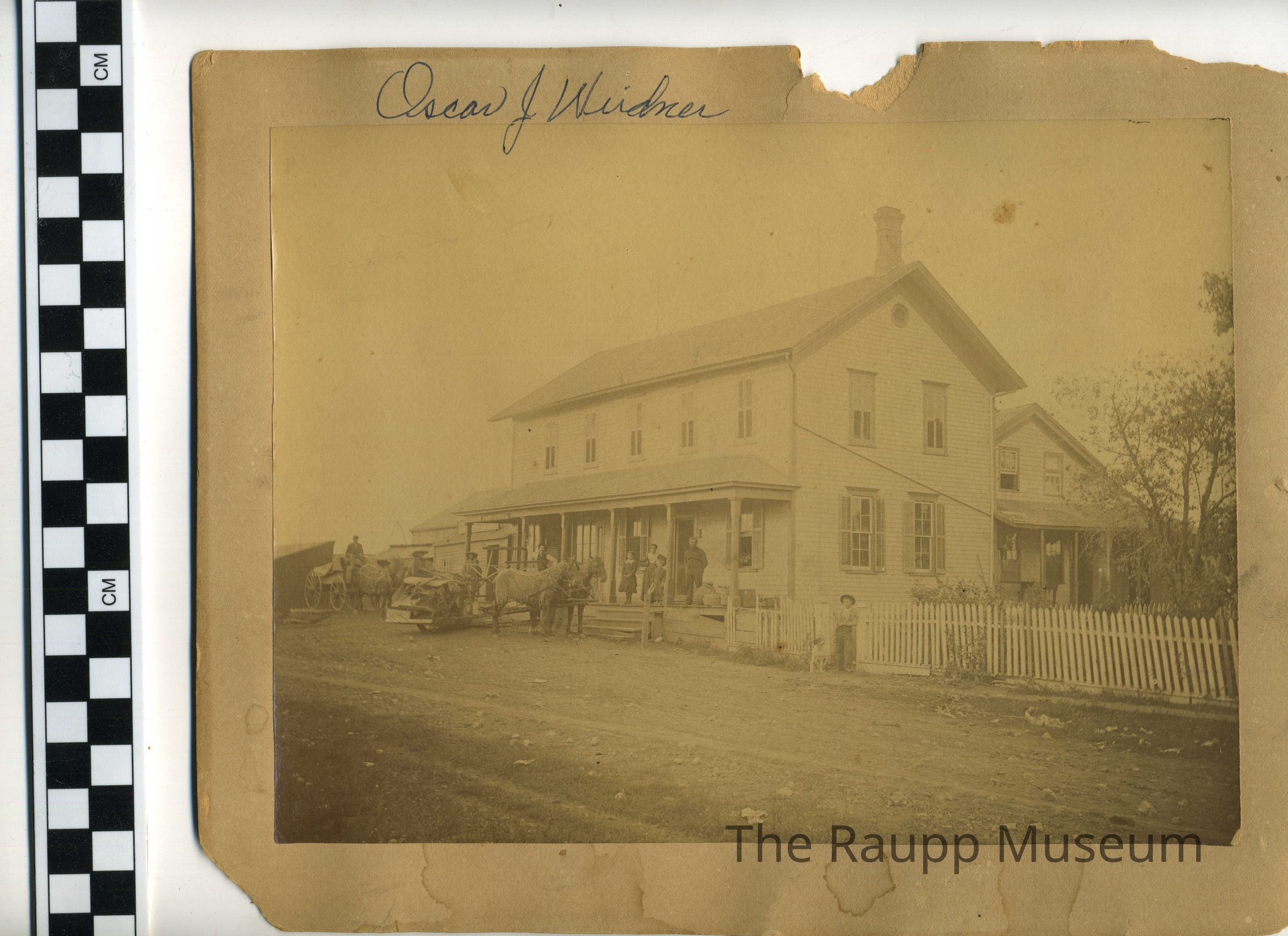 Sepia print mounted to a crumbling tan card with "Oscar J Weidner" in upper left corner. Image of the exterior of a large house with porch and a picket fence on the right side. A man, woman, and two children standing on the porch in front of the doorway. Unpaved road in the foreground. The house is possibly the Weidner store (tiny Post Office sign on the left side of the house).Made/Created