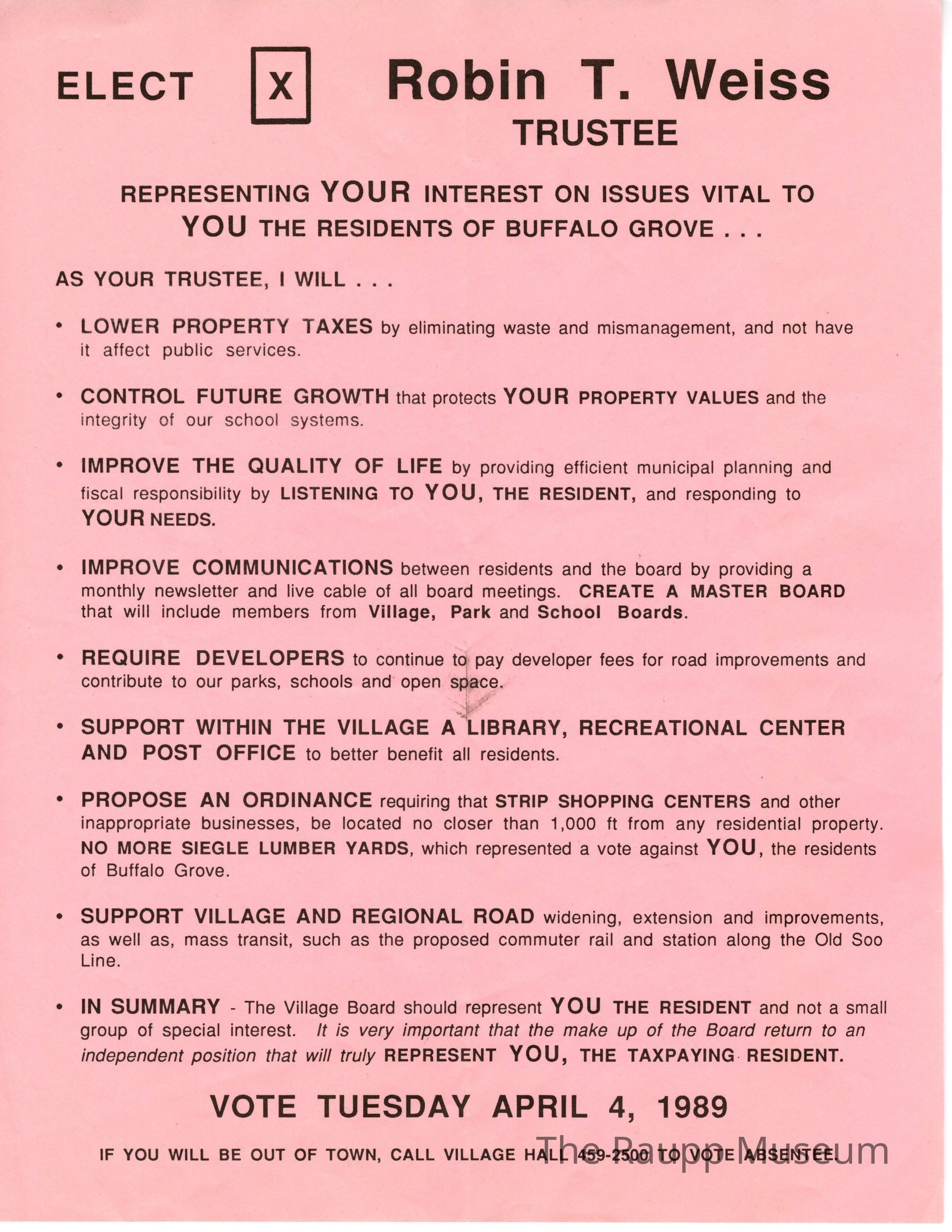 One (1) pink election pamphlet for Robin T. Weiss, is one-sided and has stances listed.
