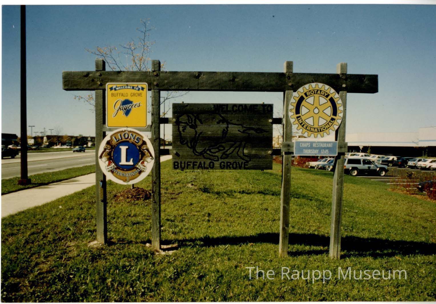 One (1) color photograph of the welcome sign in BG. Sign as wooden square with buffalo on it and "Welcome to Buffalo Grove" in center. On left is Jaycees and Lions club signs and on right is Rotary sign. There are cars in a lot on right and road on left.Made/Created