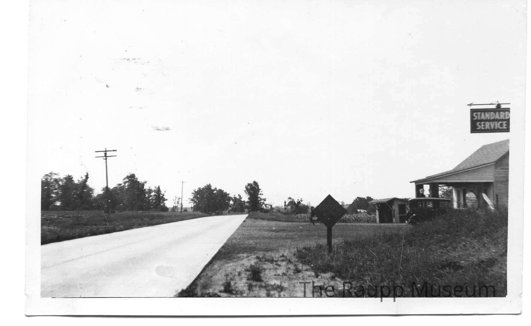 Accompanying archivist note indicates: "Looking south on Route 83 (McHenry Road), C. 1930. Frank Welter's Standard Oil filling station on left. Route 83 was paved C. 1928."Made/Created