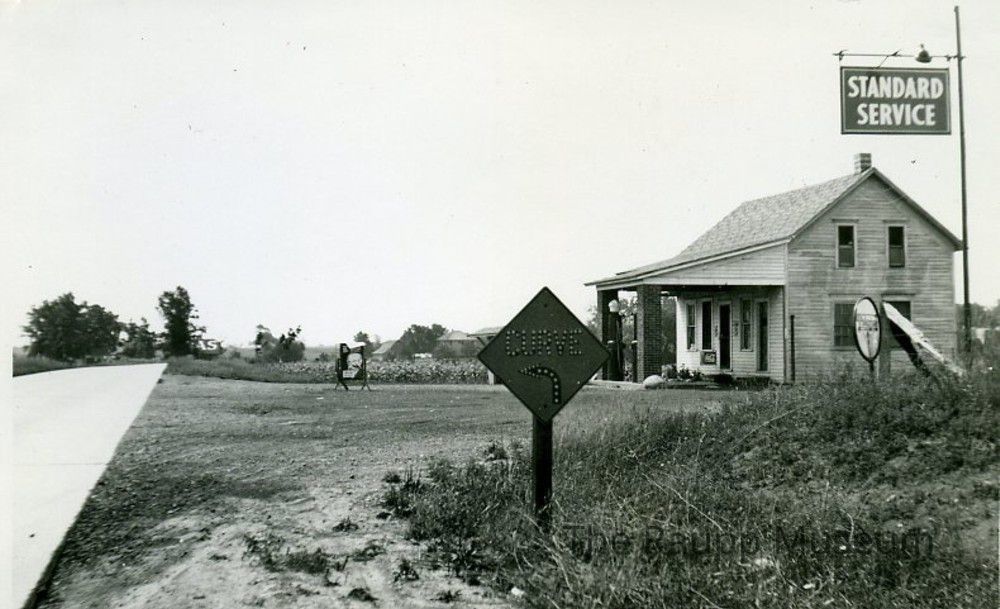 Black and white print with white border. Image of a gas station building on the side of a road with a diamond shaped "curve" sign in the center foreground. Tall "standard service" sign on the right side of the image. Two service pumps in front of the building between brick columns. Station was owned by Frank Welter.