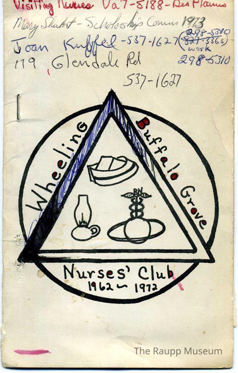 Softcover tan booklet with side staple binding. Front cover has a triangle inside of a circle logo with Wheeling Buffalo Grove Nurses' Club. Front cover has handwritten names and phone numbers on the upper portion in ink and pencil. Logo has been doodled on with red and blue ink. Aged typing paper pages with 1973-1974 events and member contact information. 12 pages.Archive Details