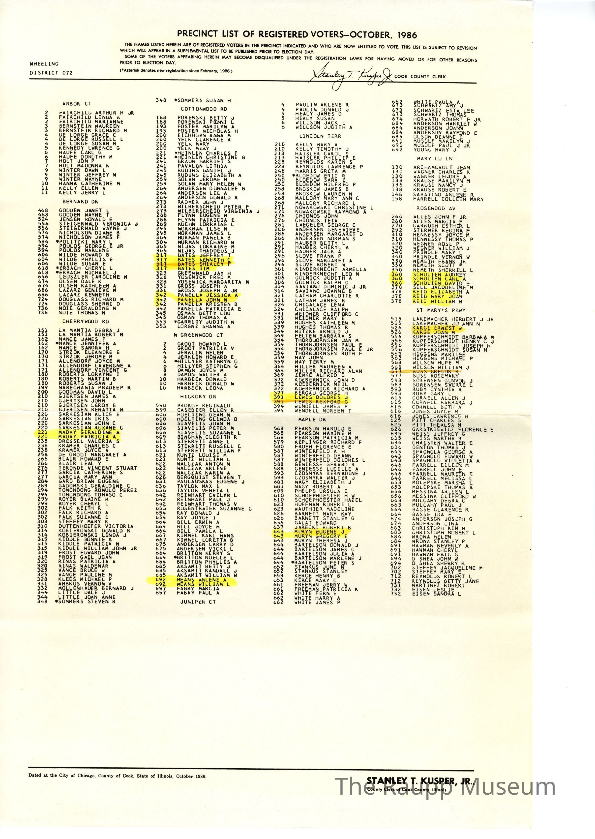 Wheeling District 072 Voters List 1986