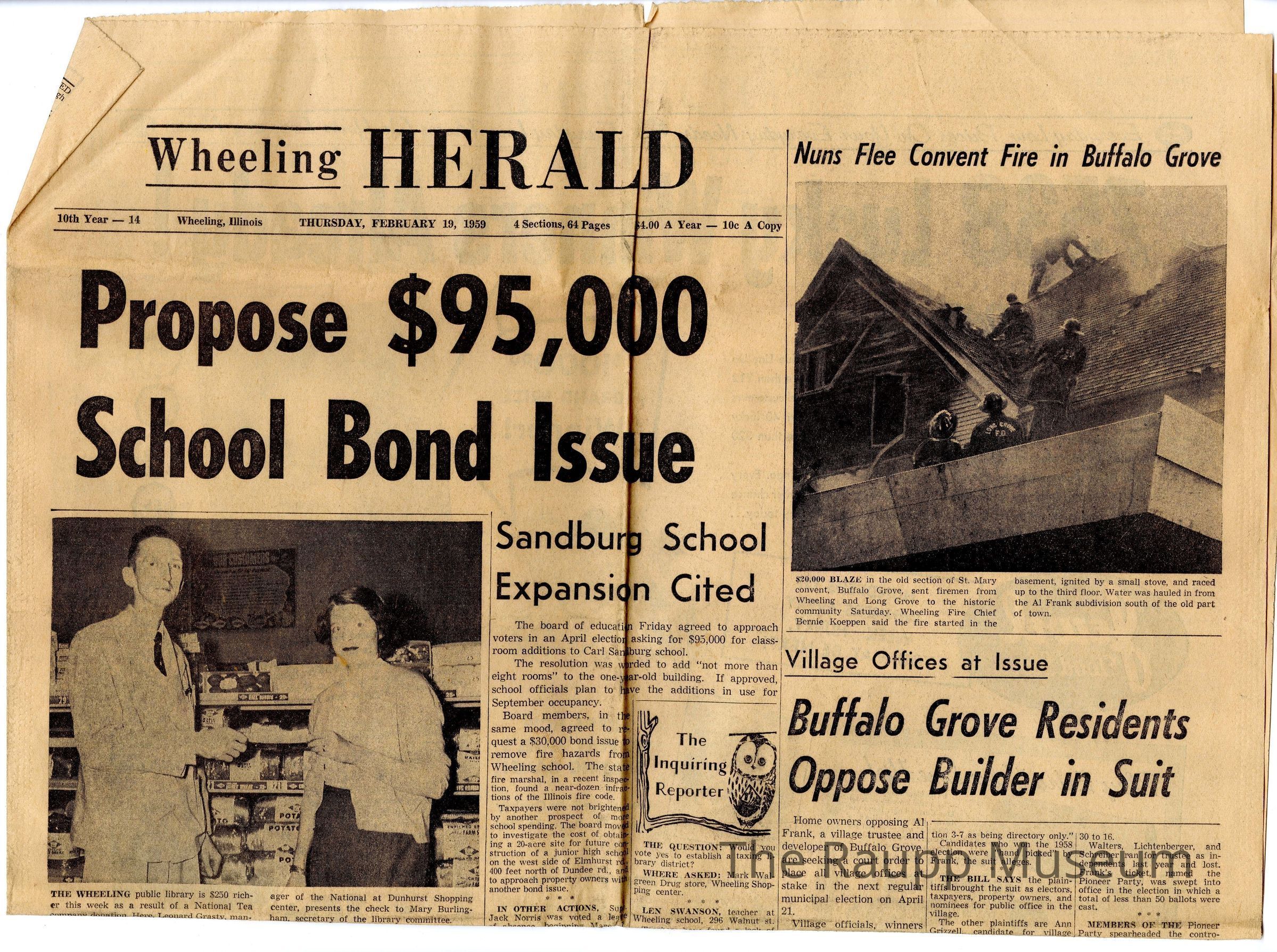 The Wheeling Herald Newspaper 10th year, 14th edition, from February 19, 1959, with the headline "Propose $95,000 School Bond Issue", with a few articles related to Buffalo Grove. On the front right top corner is a picture of a fire at St. Marys Convent. Underneath is an article "Buffalo Grove Residents Oppose Builder in Suit".Publication Details
