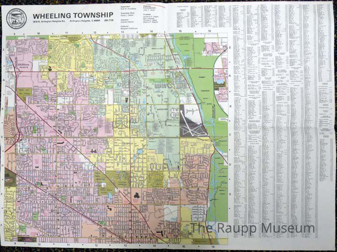Single-sided color street map of Wheeling Township. With white background and square color-coded map on the left side. Lists of public officials in the township and street index on the right side. "Wheeling Township" and circular logo in the upper left corner.