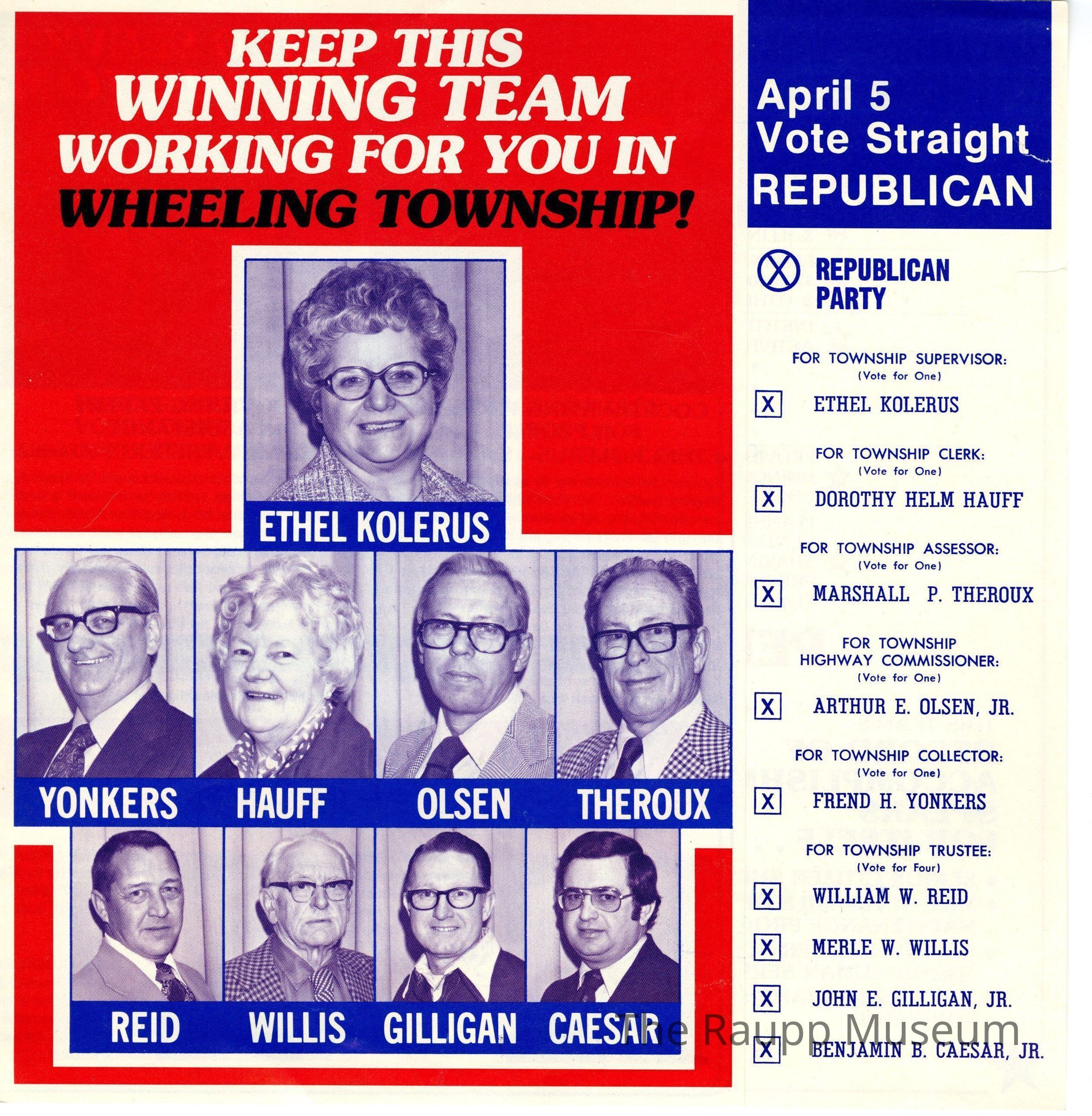 One (1) folded pamphlet for Wheeling Township Republican election candidates C. 1980. Contains photos on front of all candidates, information inside. Red, Blue and white.