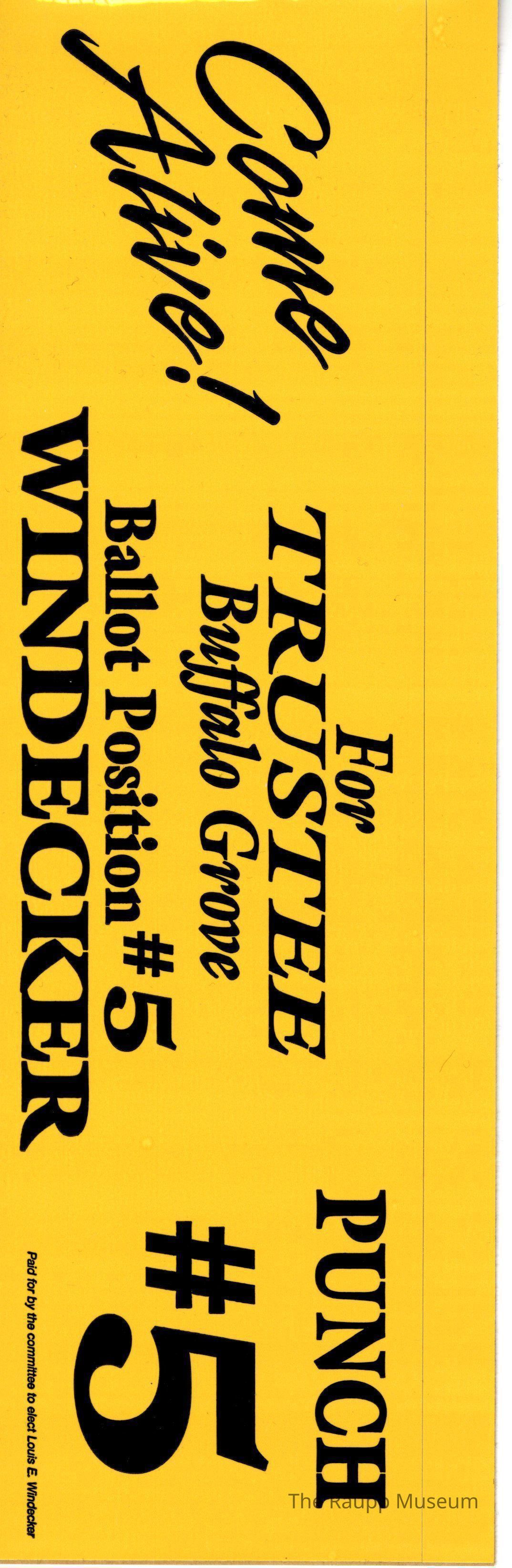 One (1) yellow and black rectangular bumper sticker for BG Trustee Windecker.