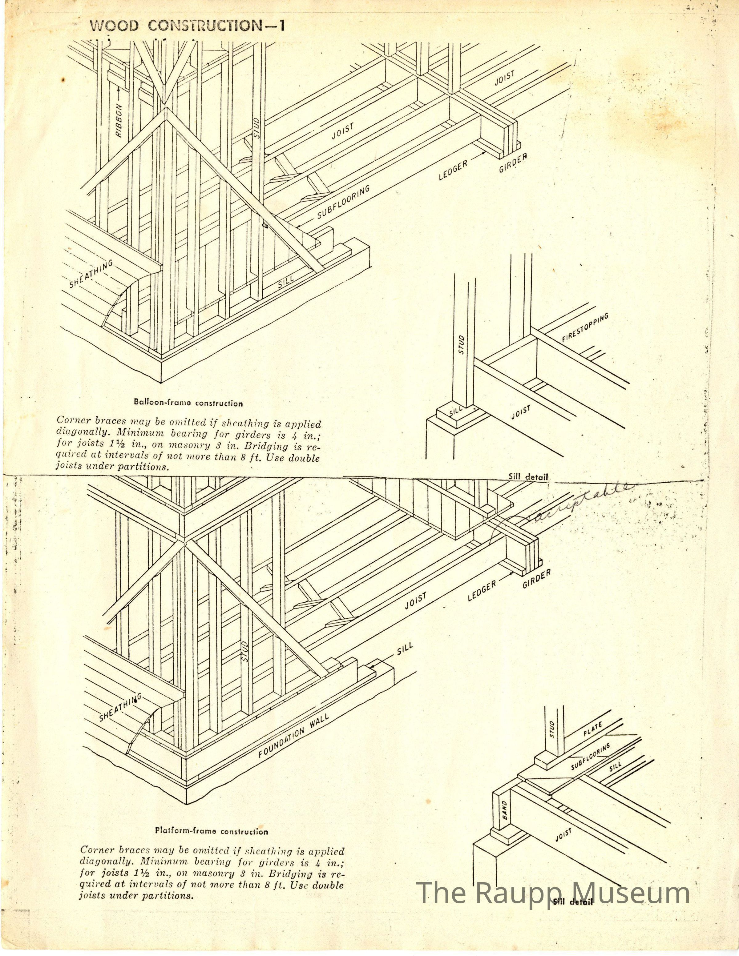 One (1) single sided printed page of technical drawings with notes about wood construction. Top half concerns Balloon-frame construction with a drawing and paragraph, and bottom half concerns Platform-frame construction with a drawing and paragraph demonstrating this.Archive Details