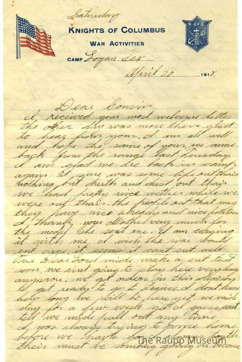 Two page correspondence on tan Knights of Columbus letterhead paper with envelope. Writing on three sides. Dated April 20, 1918. Lined handwritten letter in black ink about the weather, going to the range, making the best of being in the service.