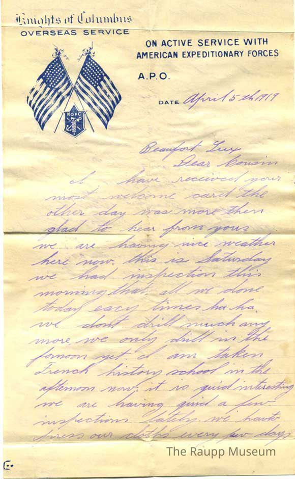 One page correspondence (two sides) on tan Knights of Columbus letterhead and envelope. Blue Knights of Columbus Oversees Service logo in the upper left hand corner with “On active service with American Expeditionary Forces APO” across the upper center.
