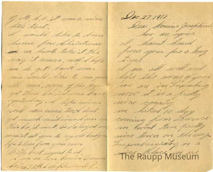 Two page correspondence on one tan lined paper with bi-fold and tan envelope. Writing on all four sides. Letter in black ink about Raupp being in Luxembourg and the people he met. Envelope addressed to “ Miss Josephine Raupp Arlington Heights Illinois, USA. From Pvt. Bernard Raupp US infantry commission AEF." With black postdate stamp Dec 30, 1918 and black censor stamp with a handwritten signature in the center.Archive Details