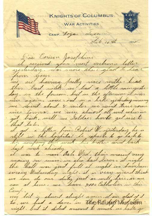 Envelope has Knights of Columbus logo in left corner addressed to "Miss Josephine Raupp Arlington Heights, Ills." Envelope has a cut-out area where stamp and postmark should be.Archive Details