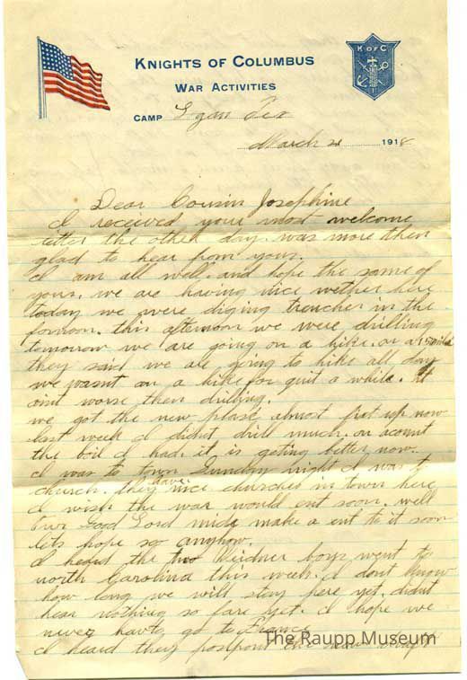 One page correspondence on tan Knights of Columbus letterhead with envelope. Writing on both sides. Dated March 21, 1918. Lined handwritten letter in black ink about the weather, drilling, digging ditches, hiking, farming, and Easter.