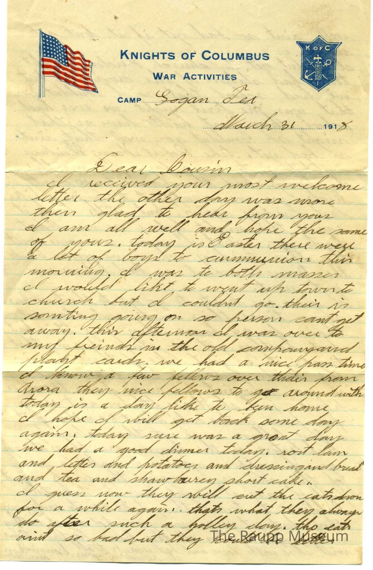 One page correspondence on tan Knights of Columbus letterheaad with envelope. Writing on both sides. Dated March 31, 1918. Lined handwritten letter in black ink about the weather, Easter holiday with friends and church.